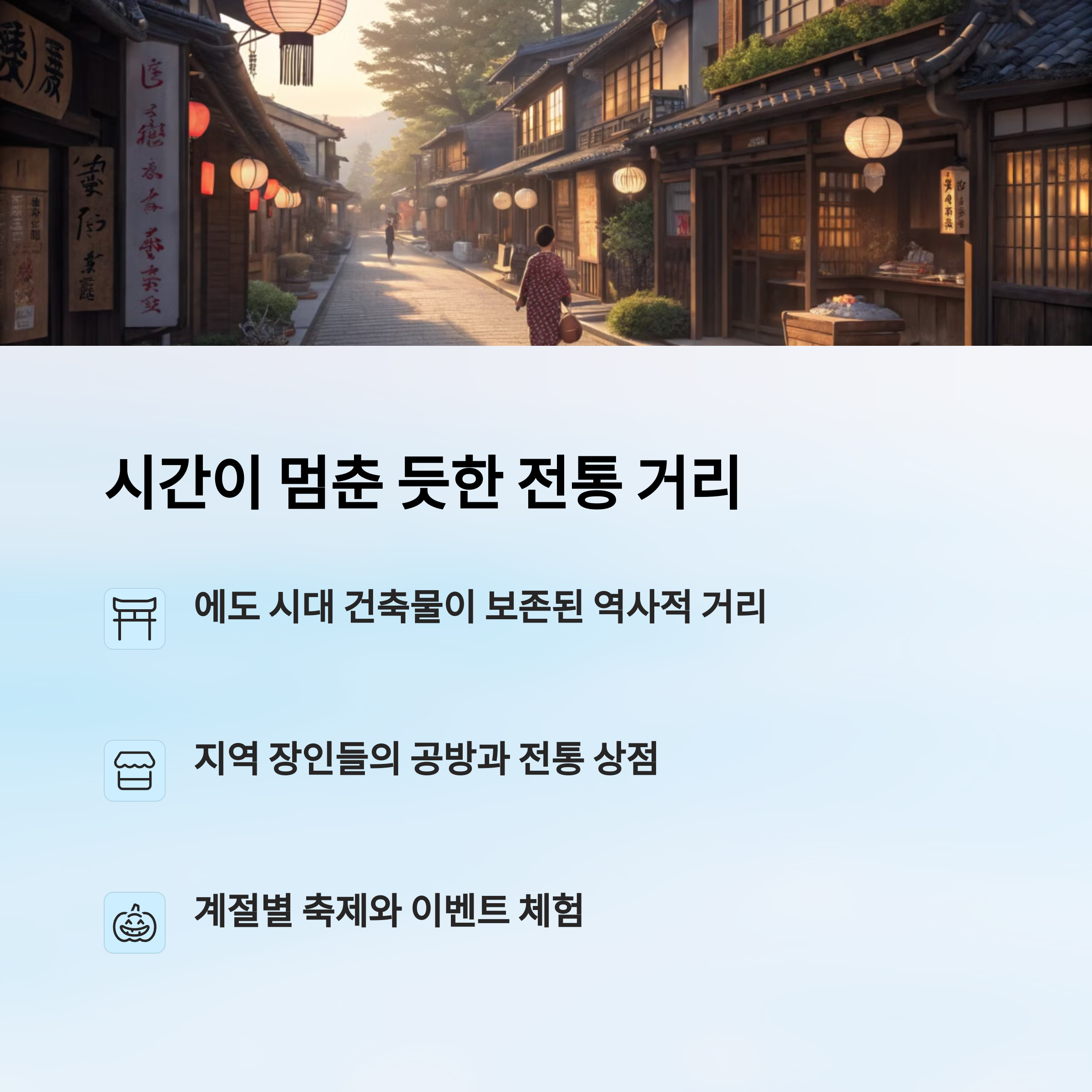 일본 소도시 여행에서 빠질 수 없는 것이 바로 전통 거리 탐방이에요. 오래된 목조건물과 돌길을 따라 걷다 보면 마치 과거로 시간 여행을 떠난 듯한 기분이 들어요. ⏳