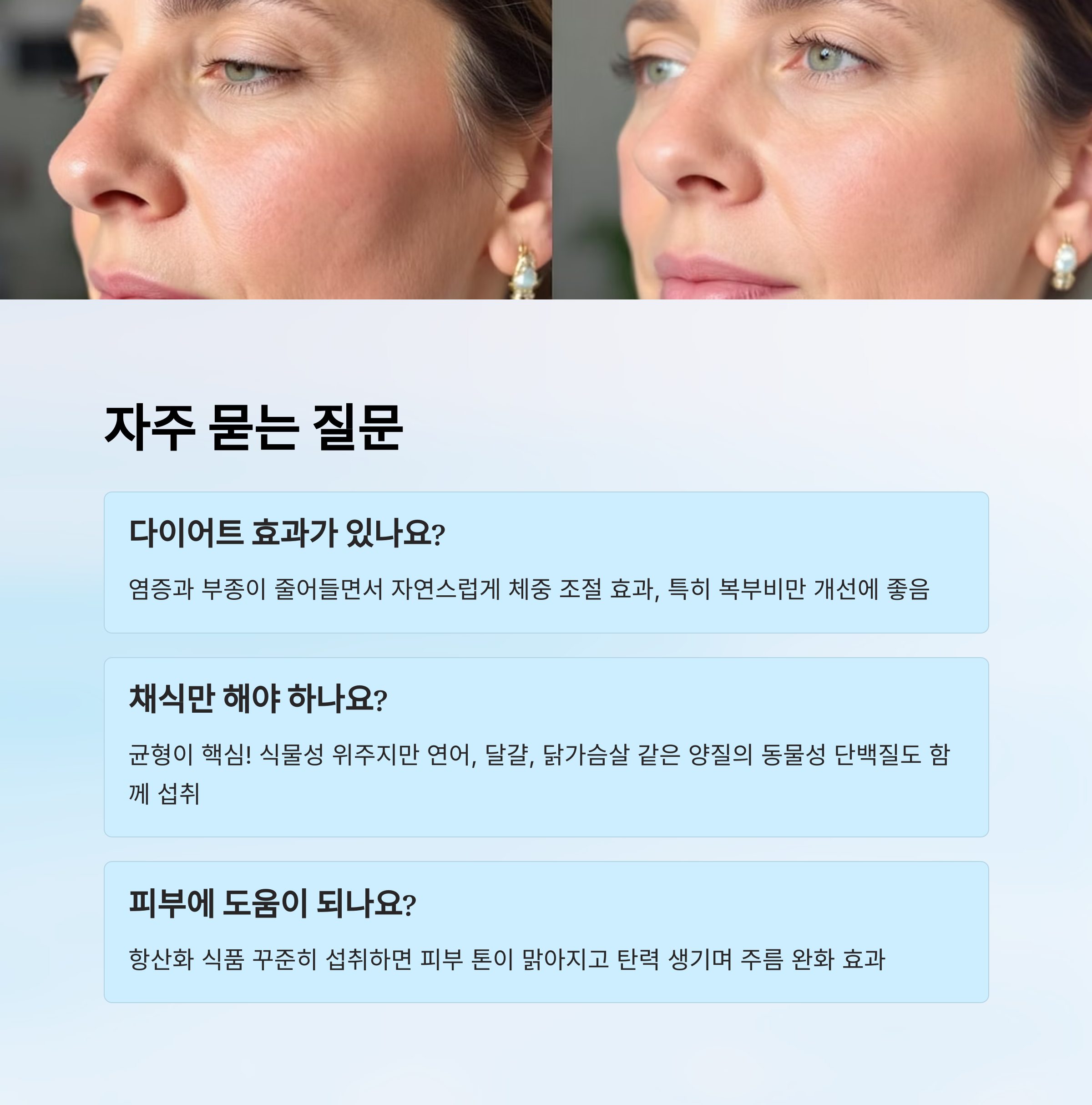 A6. 네! 항산화 식품을 꾸준히 섭취하면 피부 톤이 맑아지고, 탄력이 생기며, 주름이 완화되는 효과가 있어요. 수분 섭취도 병행하세요.