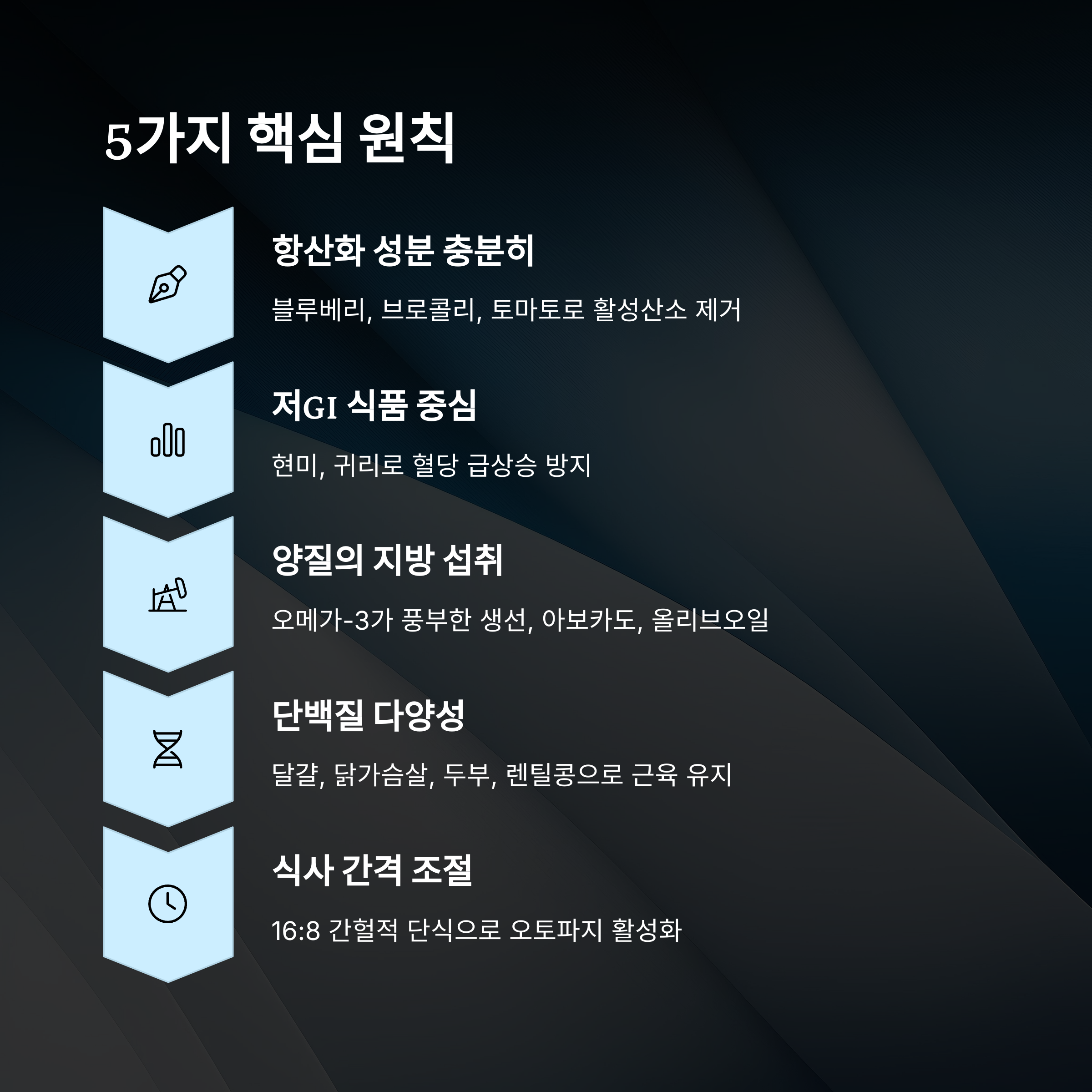 저속노화 식단은 단순한 음식 섭취를 넘어, 세포 하나하나의 노화를 늦추는 전략이에요. 이 식단은 크게 5가지 핵심 원칙을 따르는데요, 그 원칙들을 일상에 적용하면 훨씬 간단해져요. 이건 과학적 기반과 임상 데이터를 토대로 구성되었기 때문에 믿고 실천할 수 있는 식사 방법이랍니다.