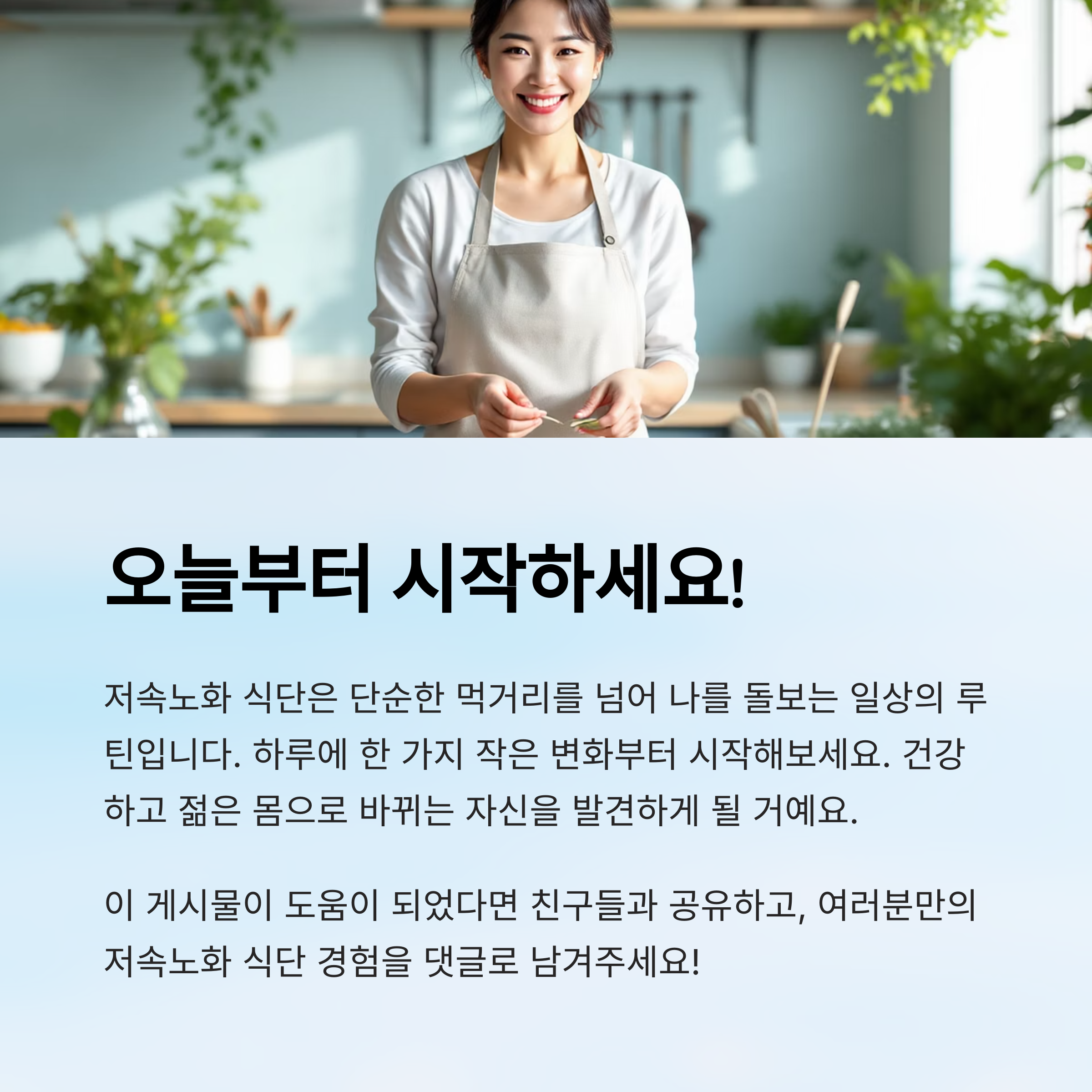 세 번째는 하루 한 끼부터 시작하기예요. 아침이나 저녁 중 한 끼만 저속노화 식단으로 바꾸는 것도 충분히 의미 있어요. 갑자기 3끼를 모두 바꾸려고 하면 스트레스만 커지거든요. 한 끼에 익숙해지면 자연스럽게 다른 식사도 따라오게 돼요.