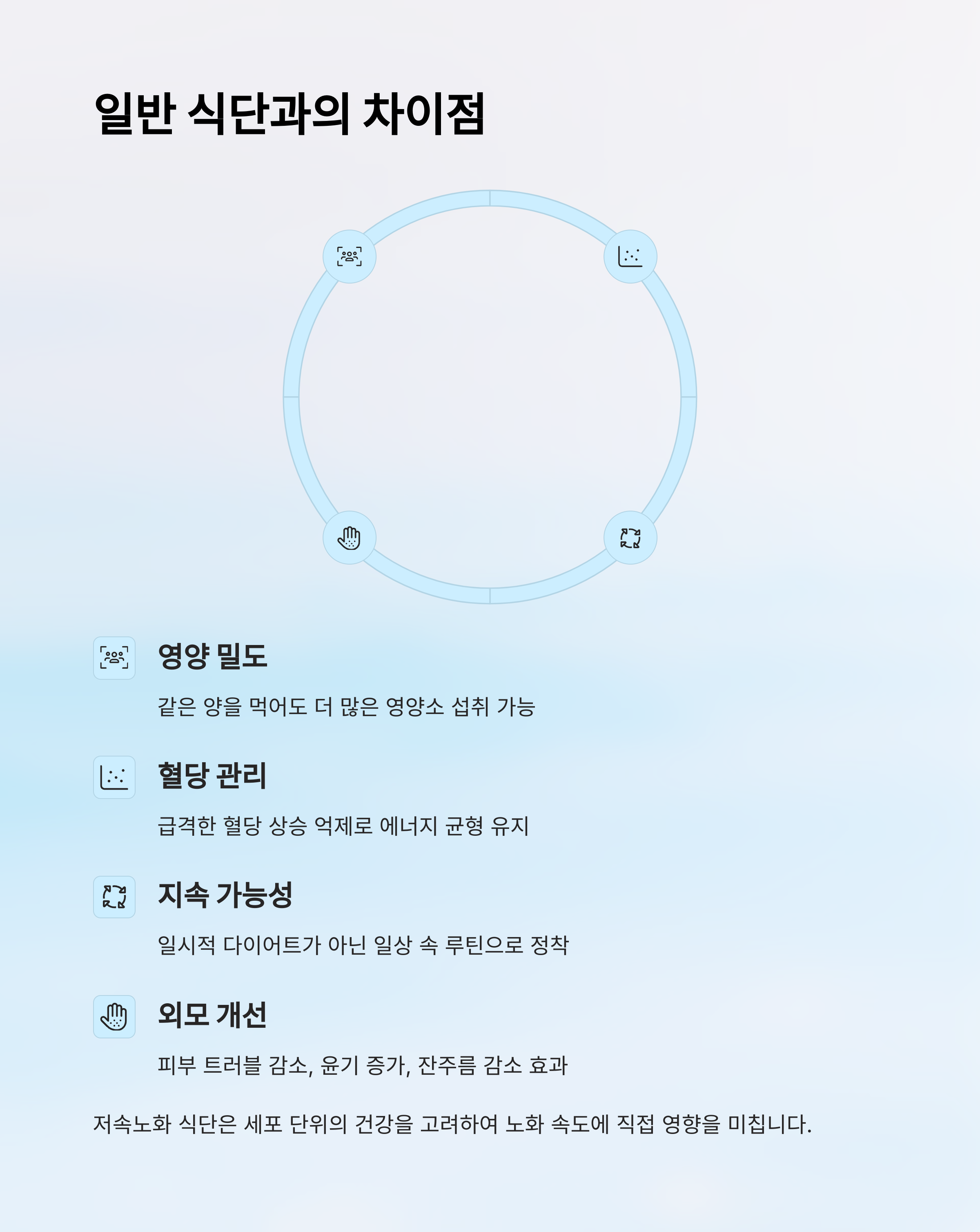 또한 저속노화 식단은 혈당의 급격한 상승을 억제하는 데 초점을 둬요. 일반 식단에서는 흔히 밥, 면, 빵 위주로 구성돼 혈당이 빠르게 오르기 쉬워요. 그 결과 에너지 급락과 피로가 쌓이게 되고, 이는 노화 촉진으로 이어질 수 있어요. 저속노화 식단은 이런 점을 방지해 주는 역할을 하죠.