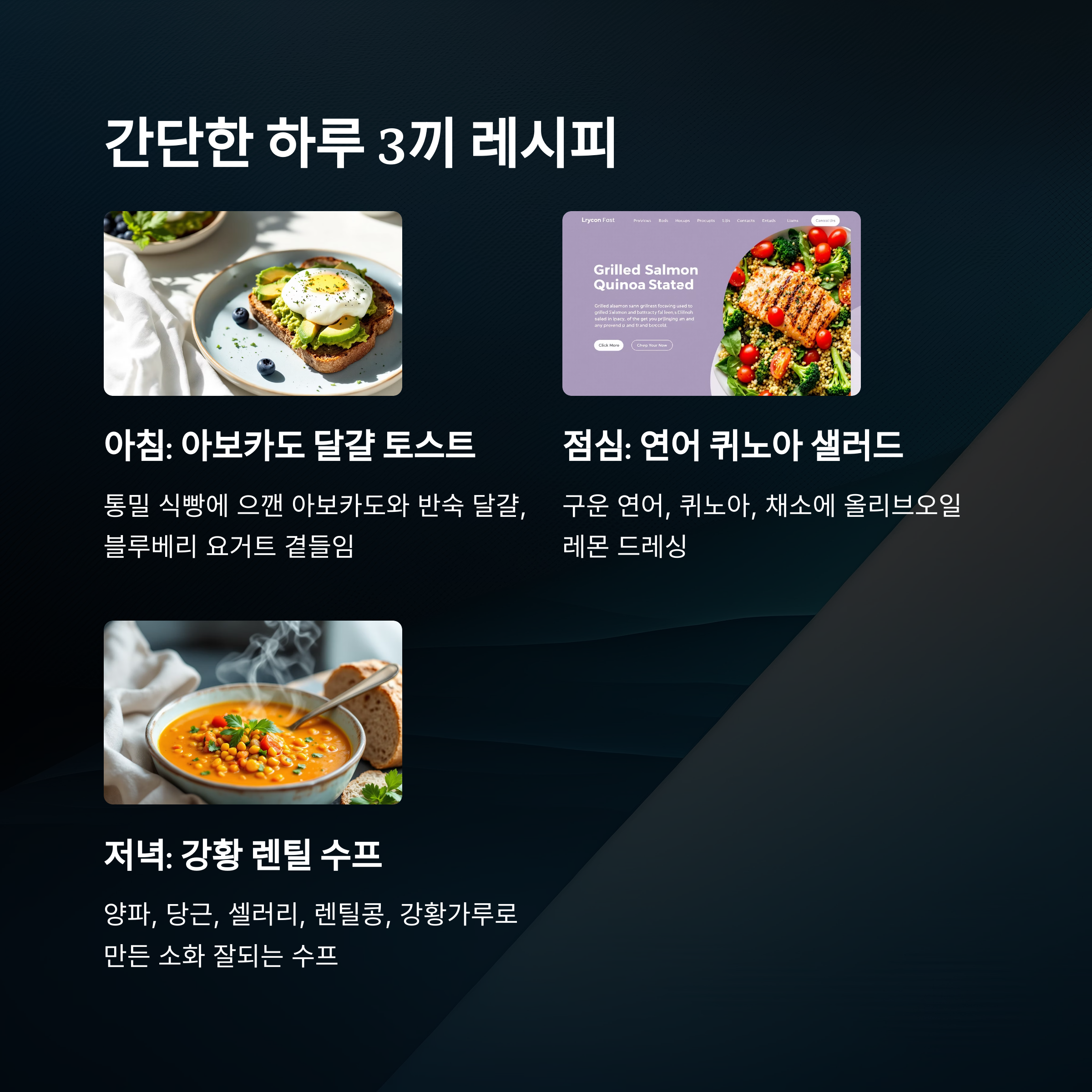 | 저녁 | 강황 렌틸 수프 + 통밀빵 | 커큐민, 단백질, 저탄수 |