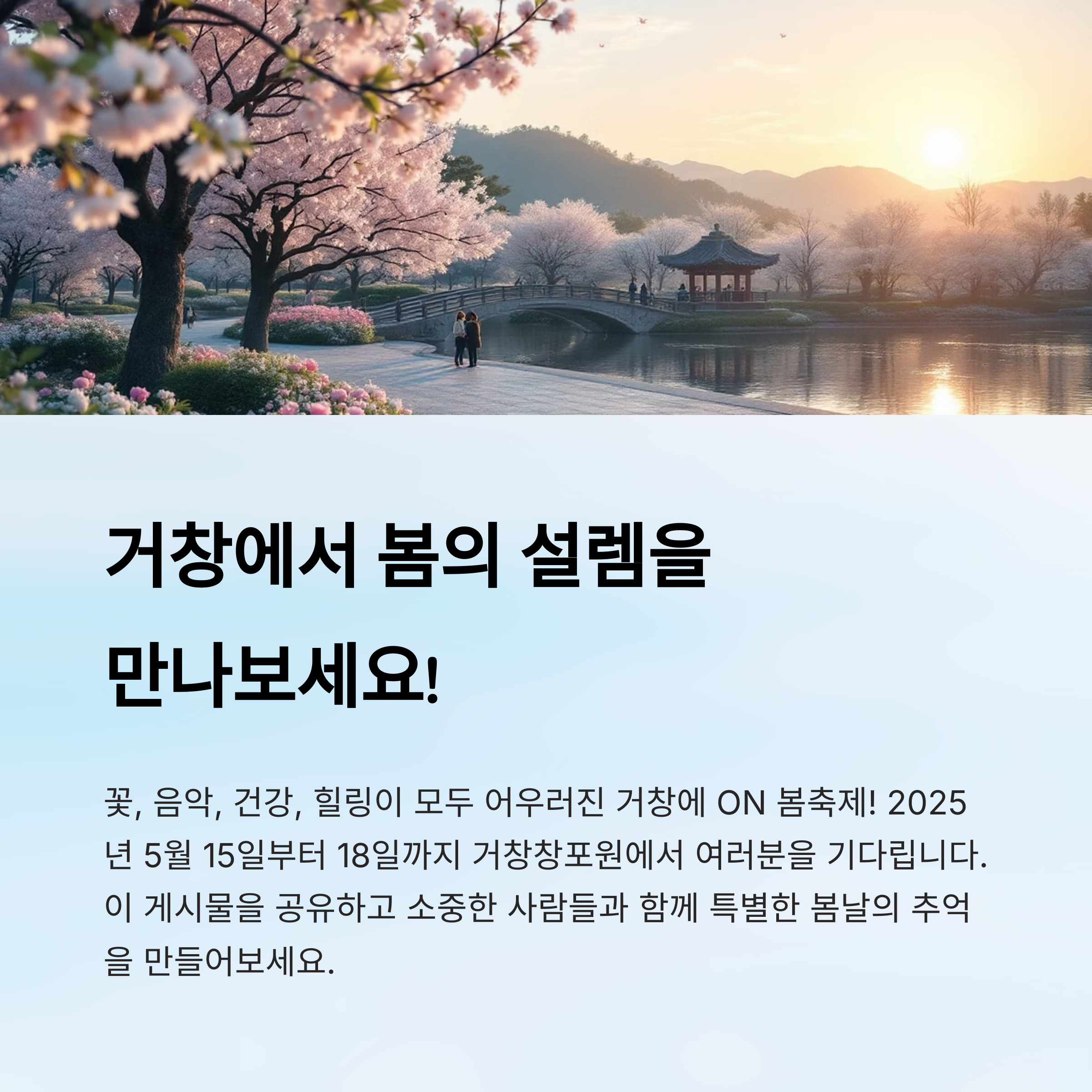 🎈 거창에 ON 봄축제는 경남 거창군이 봄을 맞아 처음으로 선보이는 통합 봄 축제로, 다양한 문화예술 행사와 체험 프로그램이 어우러진 대규모 이벤트예요.