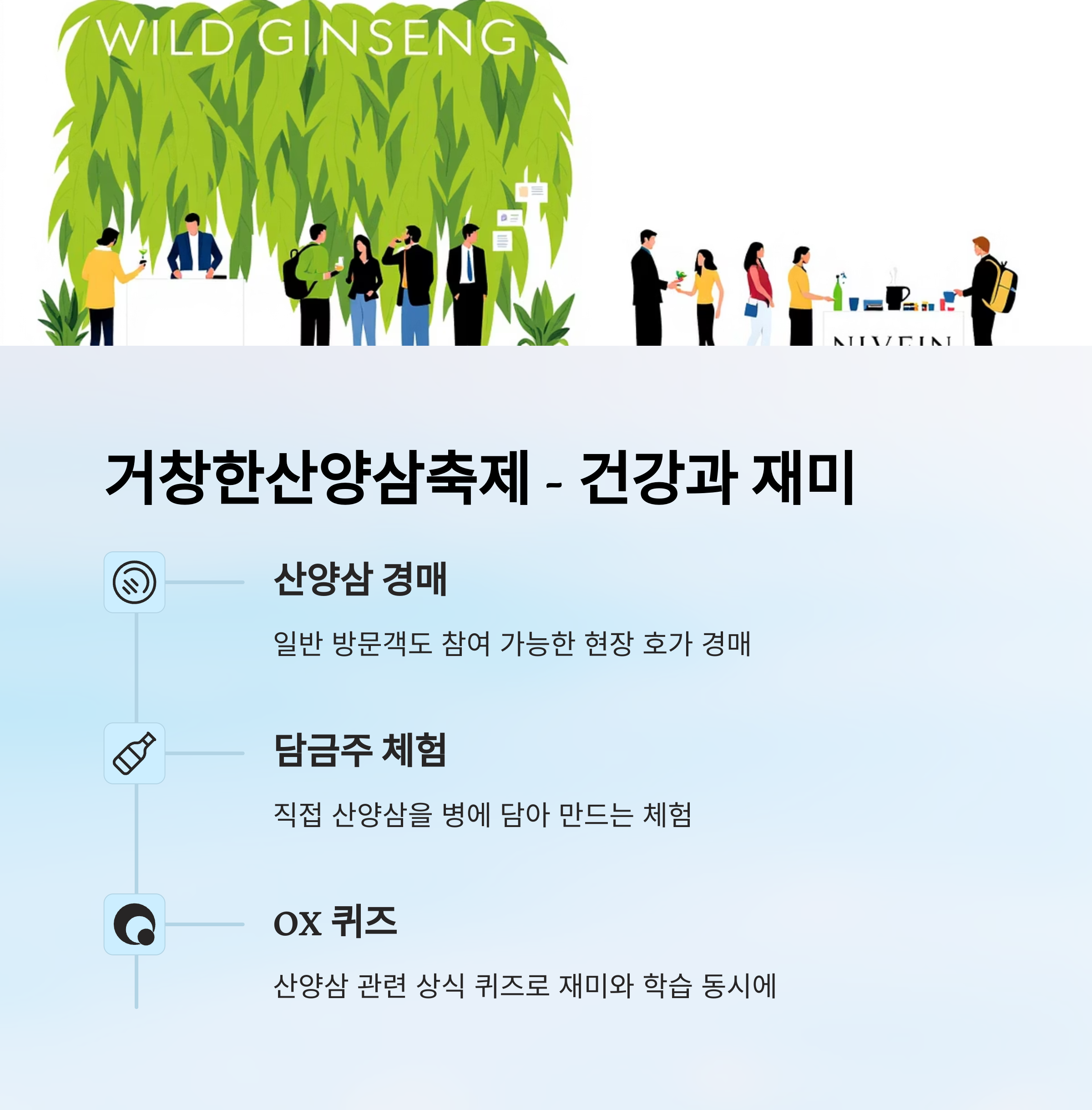 🌱 거창하면 떠오르는 대표 특산물 중 하나가 바로 산양삼이에요. 이번 산양삼축제는 5월 15일부터 18일까지 진행되며, 건강과 재미를 모두 챙길 수 있는 프로그램이 가득하답니다!