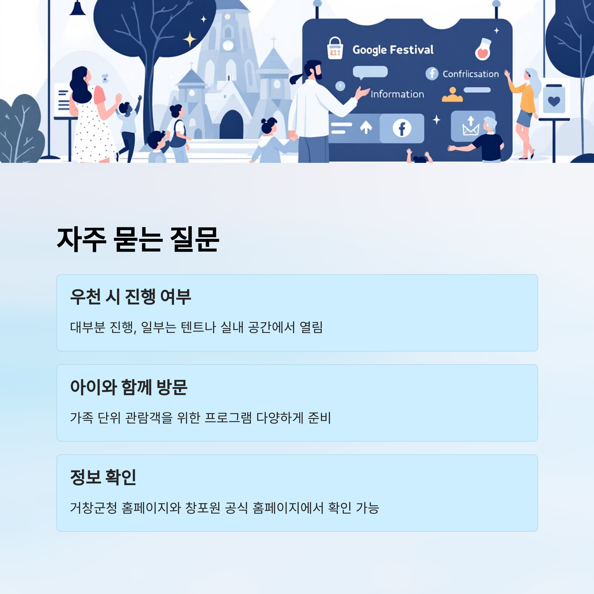 A8. 거창군청 홈페이지(https://www.geochang.go.kr)와 창포원 공식 홈페이지(https://www.gcflower.or.kr)에서 확인 가능해요.