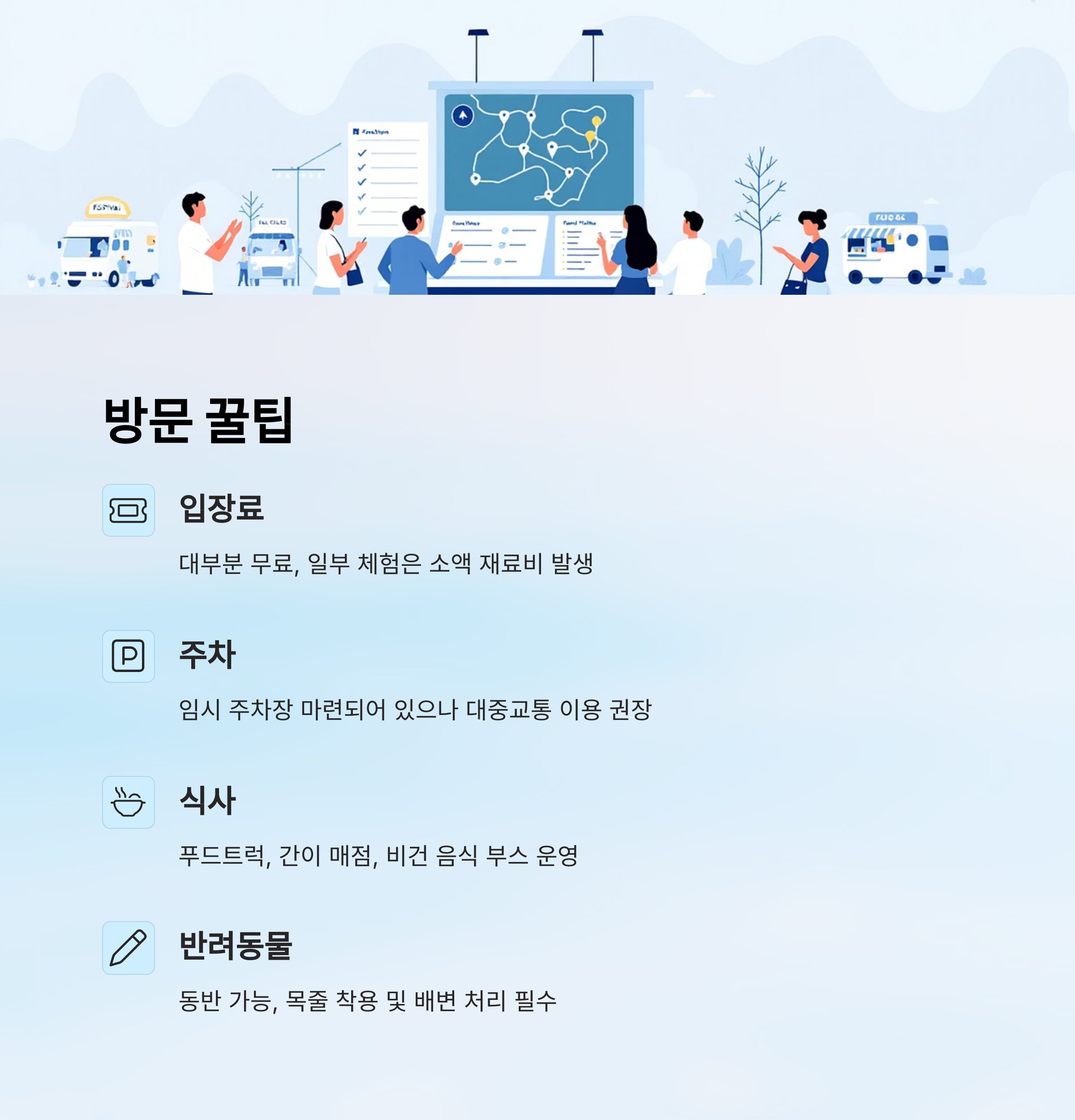 🪑 자리는 자유석으로 운영되니 일찍 도착하는 것이 좋아요. 푸드트럭과 간이 매점도 함께 운영돼 공연 전후로 간단한 먹거리도 즐길 수 있어요.