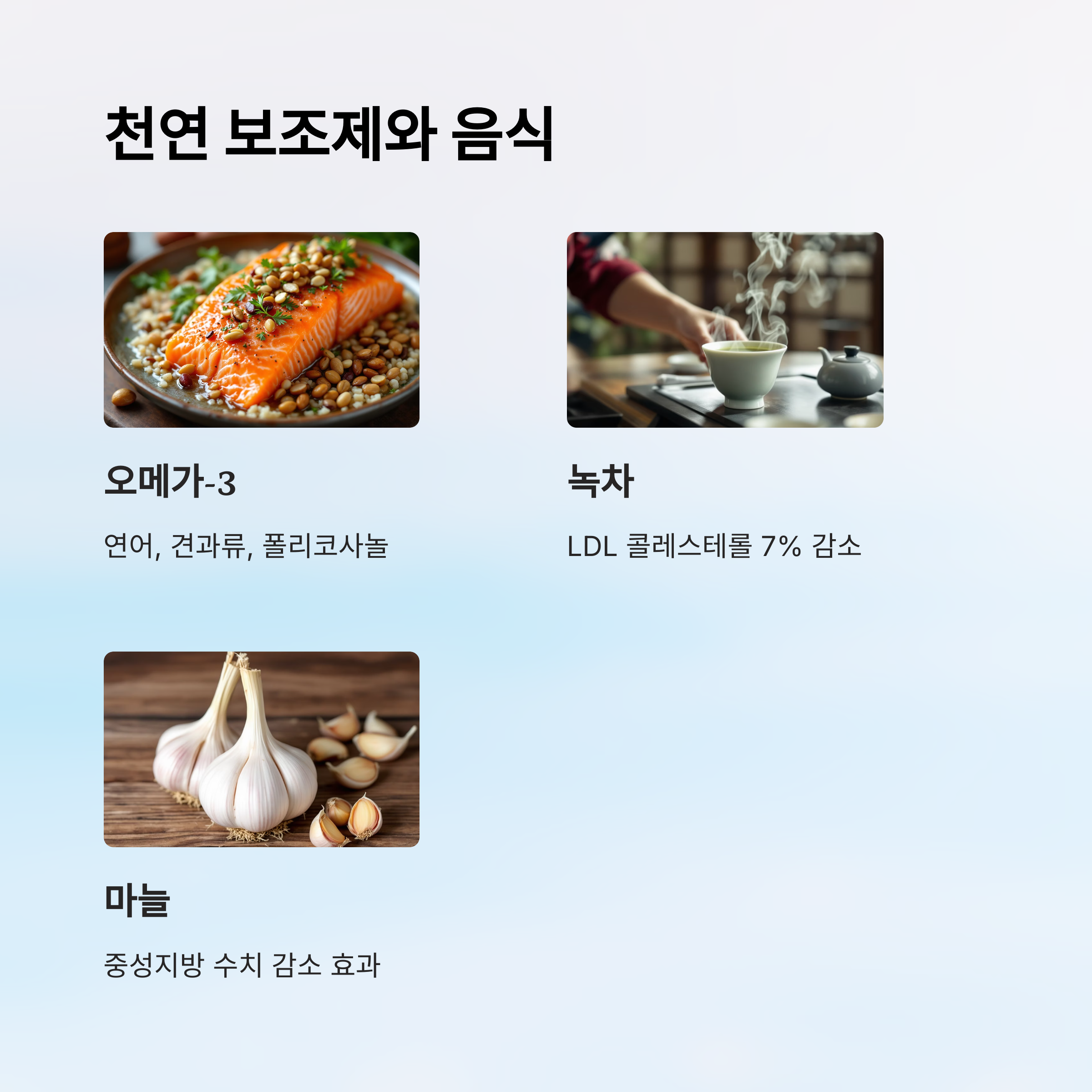 고지혈증을 자연스럽게 조절하는 방법으로 ‘천연 보조제’와 ‘특정 음식’들도 많은 주목을 받고 있어요. 꼭 약이 아니더라도 식물성 성분에서 도움을 받을 수 있답니다.