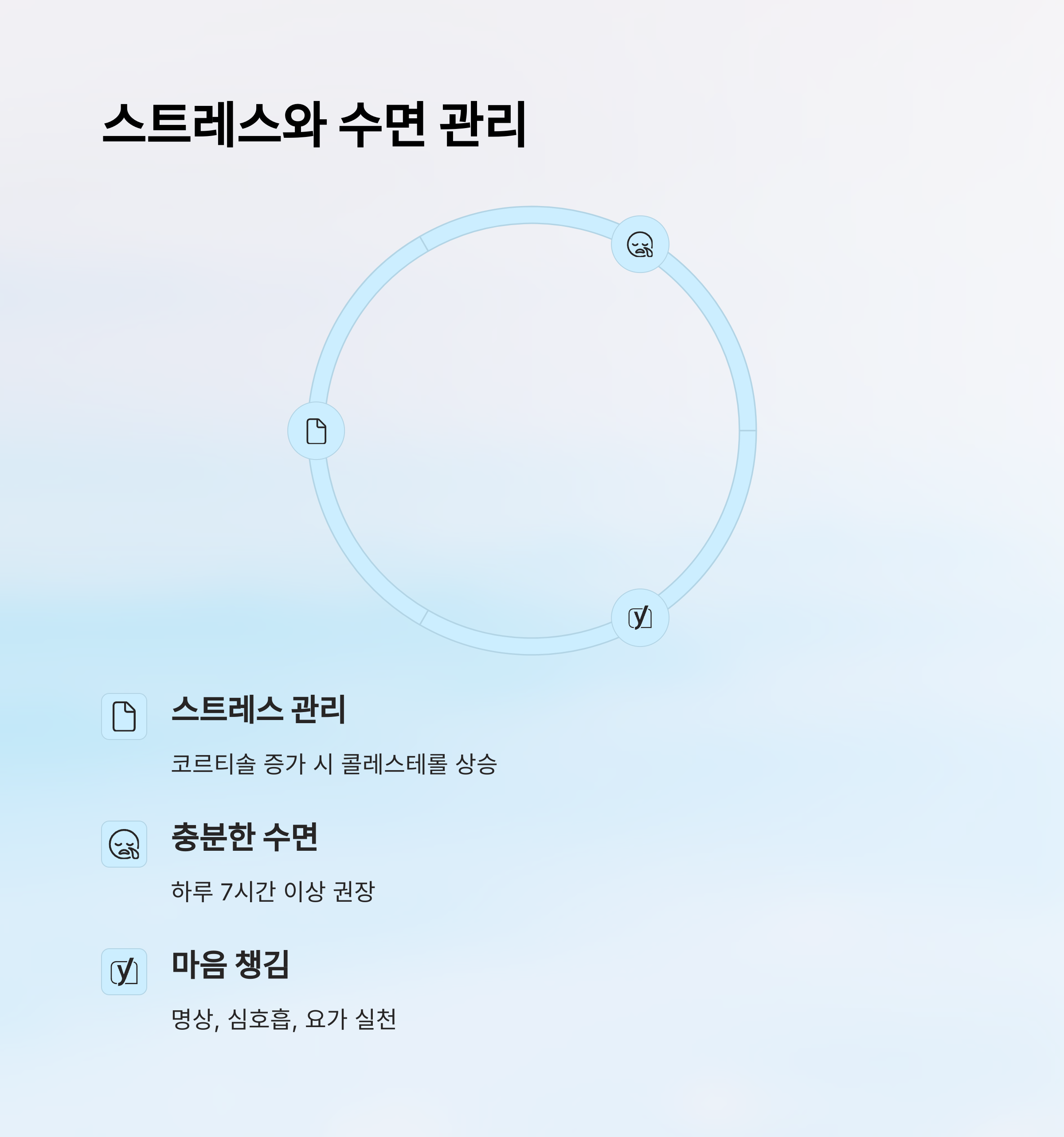 수면의 질이 낮으면 신체 회복도 느려지고, 혈압과 혈당까지 영향을 받아요. 결국 콜레스테롤 수치에도 영향을 주게 되죠.