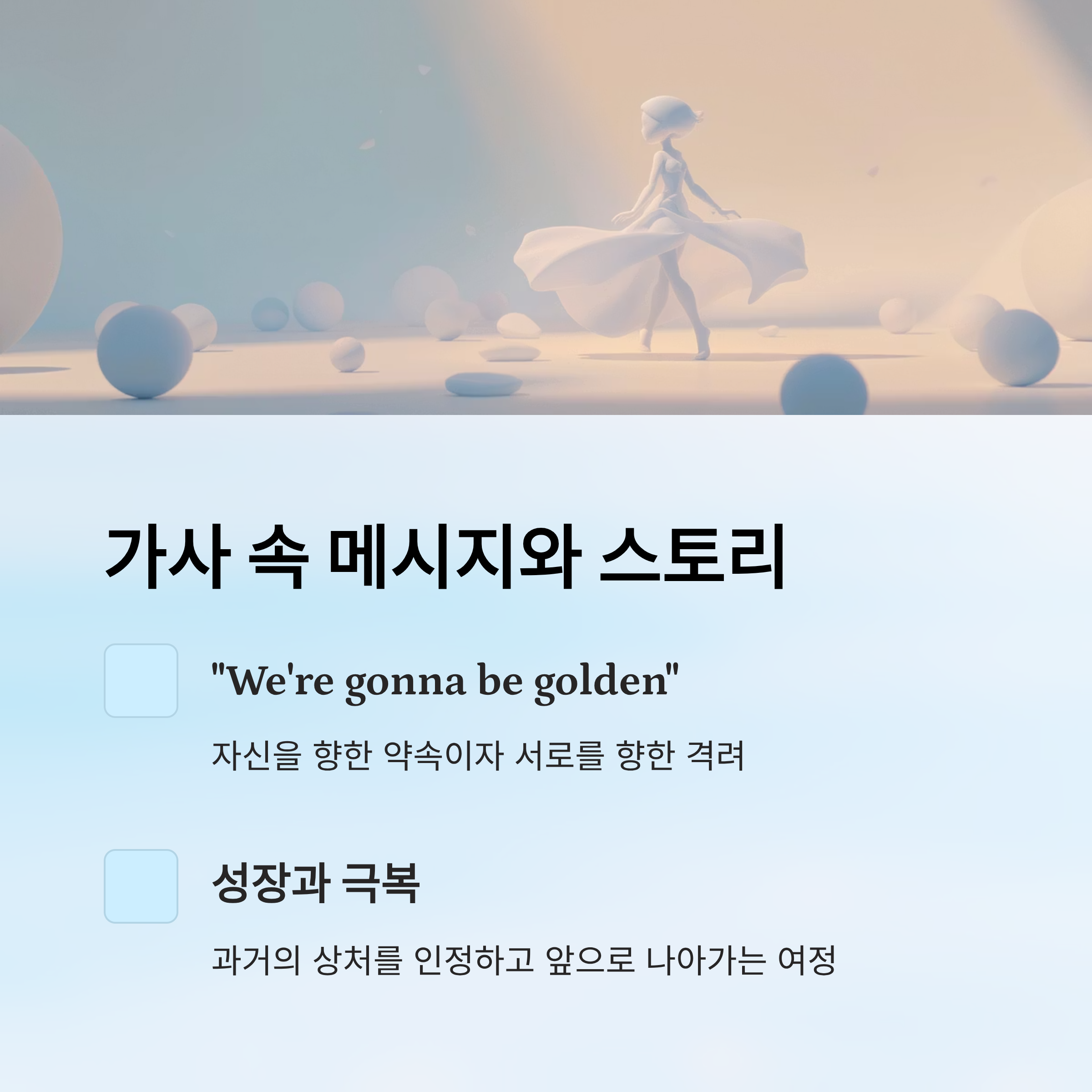 가사 속에서 반복되는 “We’re gonna be golden”이라는 문장은 단순한 선언이 아니라, 스스로를 향한 약속이자 서로를 향한 격려로 해석돼요. 특히 영어 가사임에도 불구하고 발음 가이드가 함께 제공되어, 전 세계 팬들이 언어 장벽 없이 곡의 감정을 공유할 수 있게 했어요.