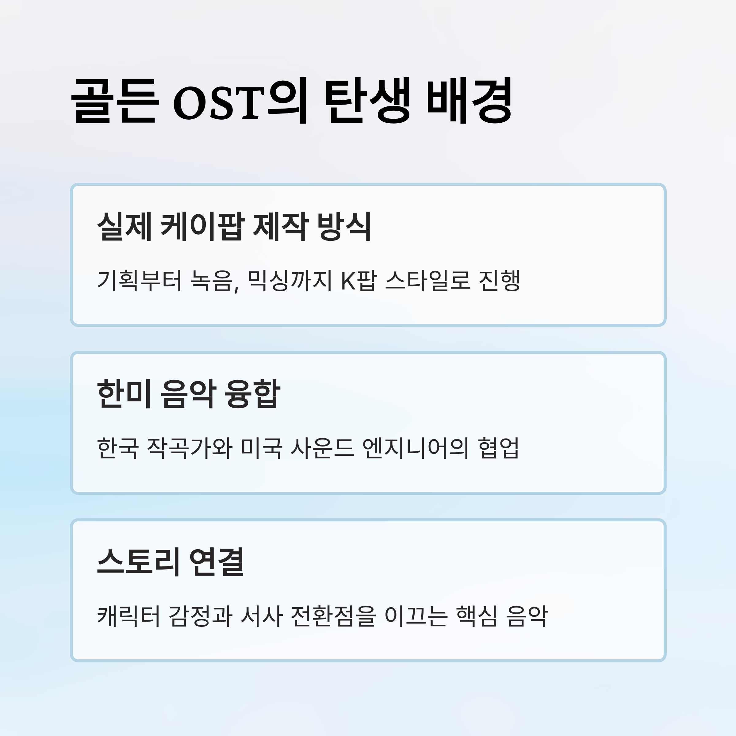 OST 기획 단계에서 가장 중점을 둔 건 ‘애니메이션 속 가상 걸그룹의 음악이 실제로도 히트곡처럼 들리게 하는 것’이었어요. 이를 위해 프로듀싱 팀은 현업 K팝 작곡가와 미국 음악계의 사운드 엔지니어들을 동시에 섭외했죠. 덕분에 한국과 미국의 음악적 색채가 절묘하게 섞인 사운드가 완성됐어요.