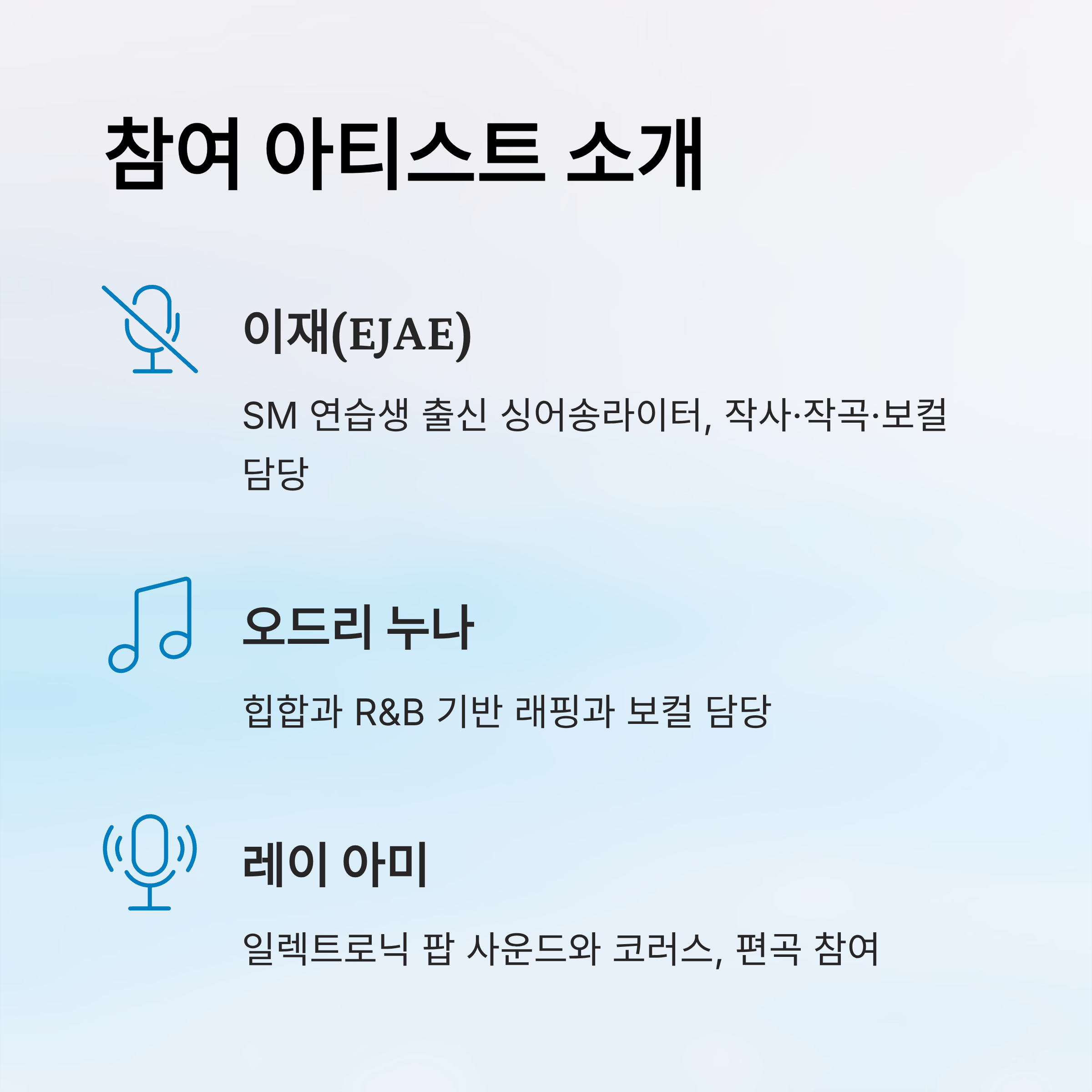 | 이재(EJAE) | 작사, 작곡, 보컬 | K팝 감성과 진정성을 모두 살린 보컬 |