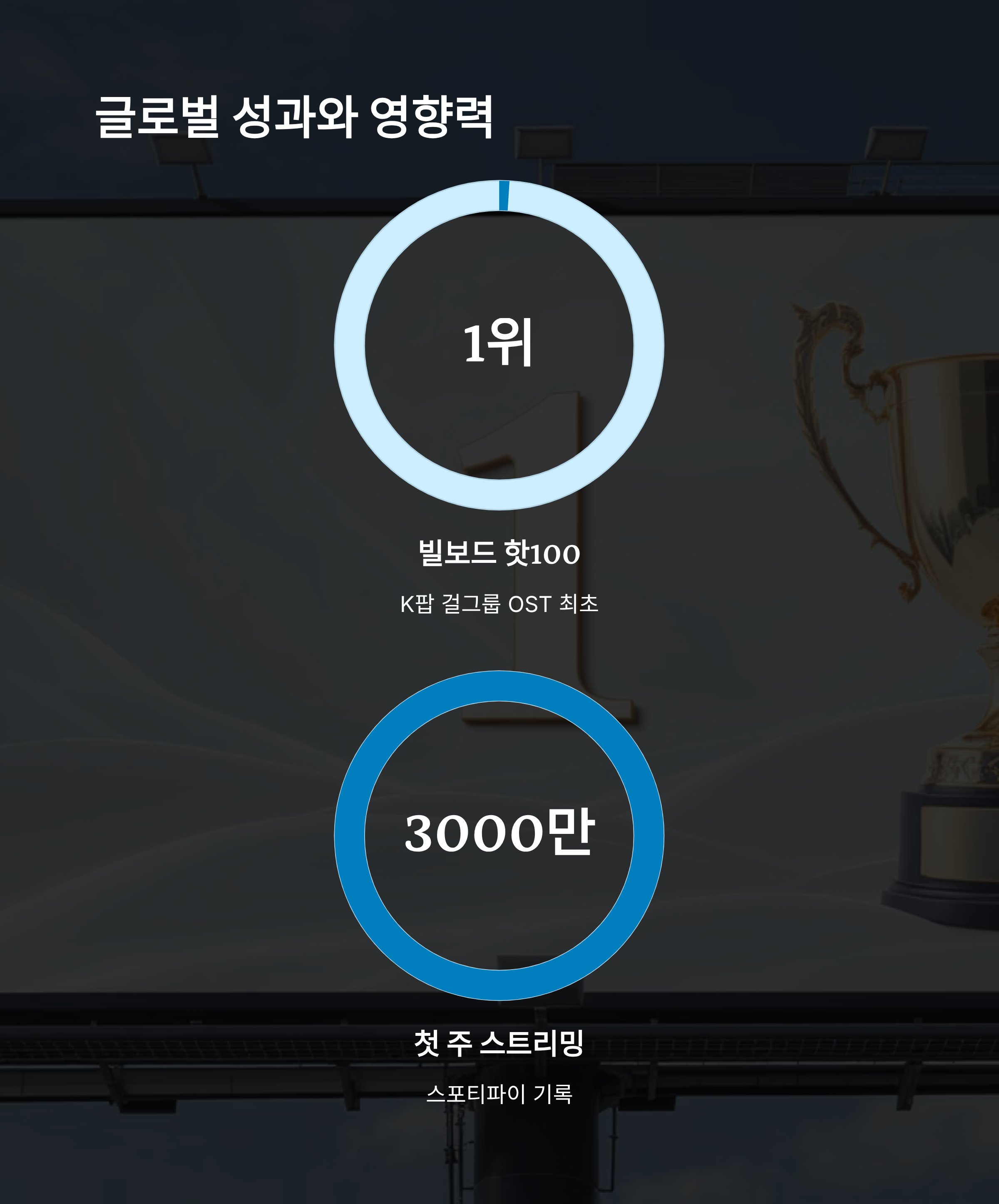 특히, 빌보드 핫100 차트에서 1위를 기록한 성과는 케이팝 걸그룹 OST 역사상 매우 이례적인 일이에요. 글로벌 음악 시장에서 OST가 이 정도의 파급력을 보여준 건, 제가 생각했을 때 케이팝의 장르 확장성과 스토리텔링 결합의 힘을 잘 보여주는 사례예요.