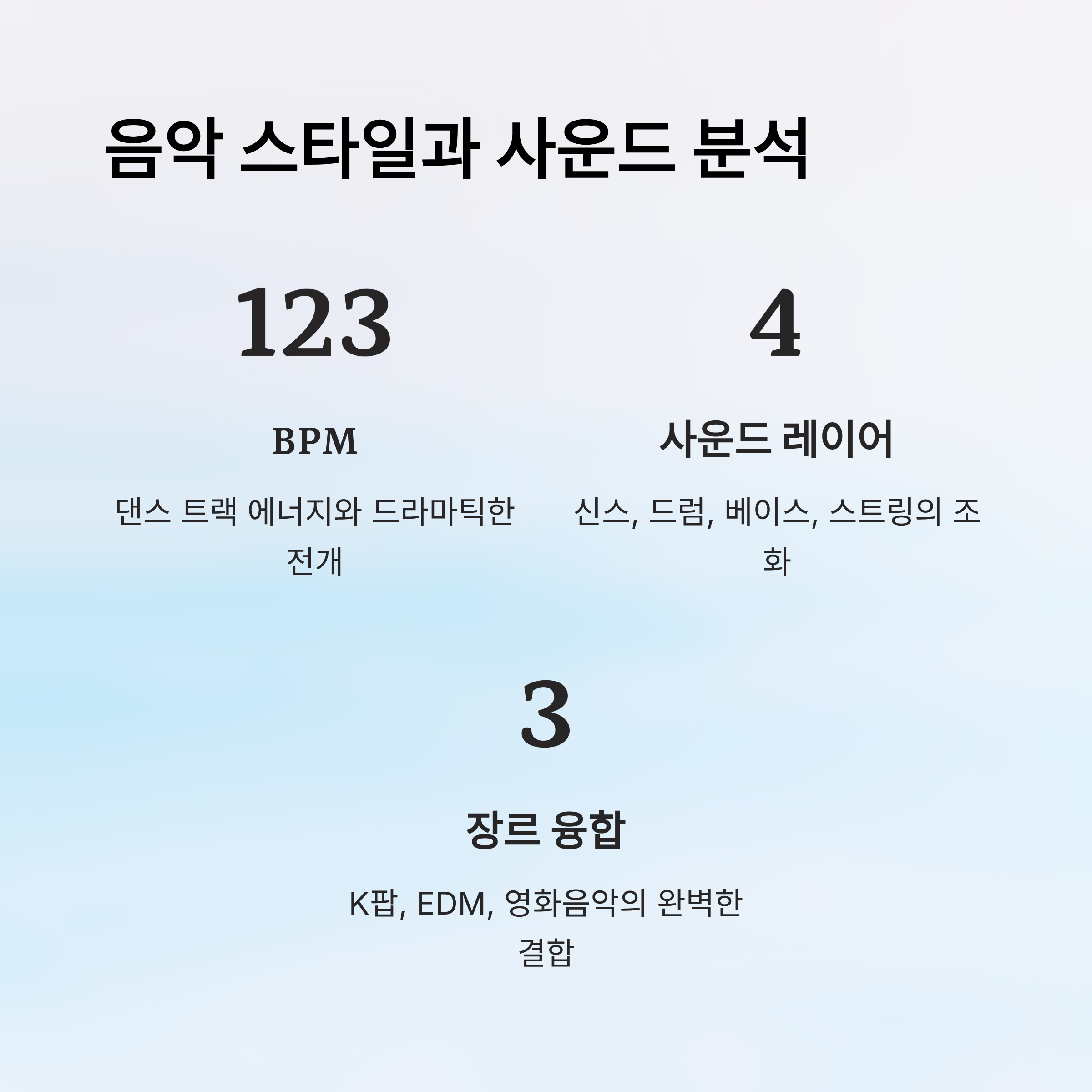 후반부 브리지에서는 템포를 살짝 줄이고, 스트링 패드와 어쿠스틱 기타가 추가되면서 감정적인 절정을 준비해요. 이후 마지막 후렴에서 모든 악기가 폭발적으로 등장해 청각적 ‘카타르시스’를 느끼게 하죠. 이 구성이야말로 영화 OST이면서도 콘서트 무대에서 바로 사용 가능할 정도의 완성도를 보여줘요.