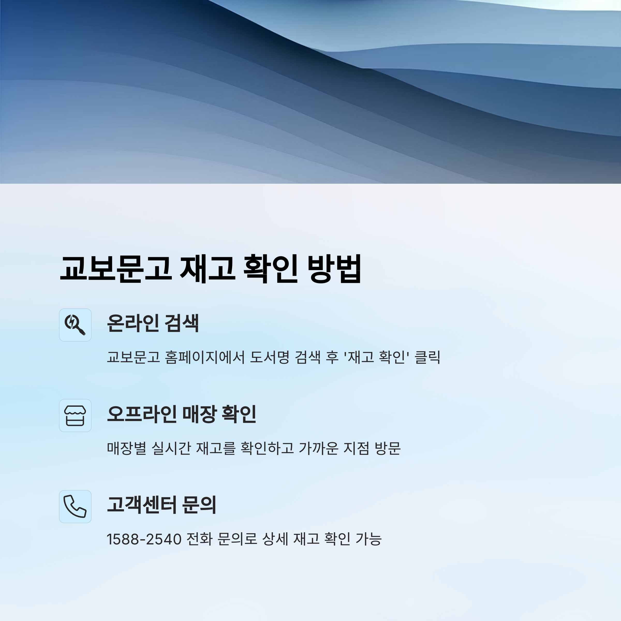 교보문고에서 원하는 책이 있는지 **온라인과 오프라인 재고를 확인하는 방법**을 먼저 알아볼게요. 📚