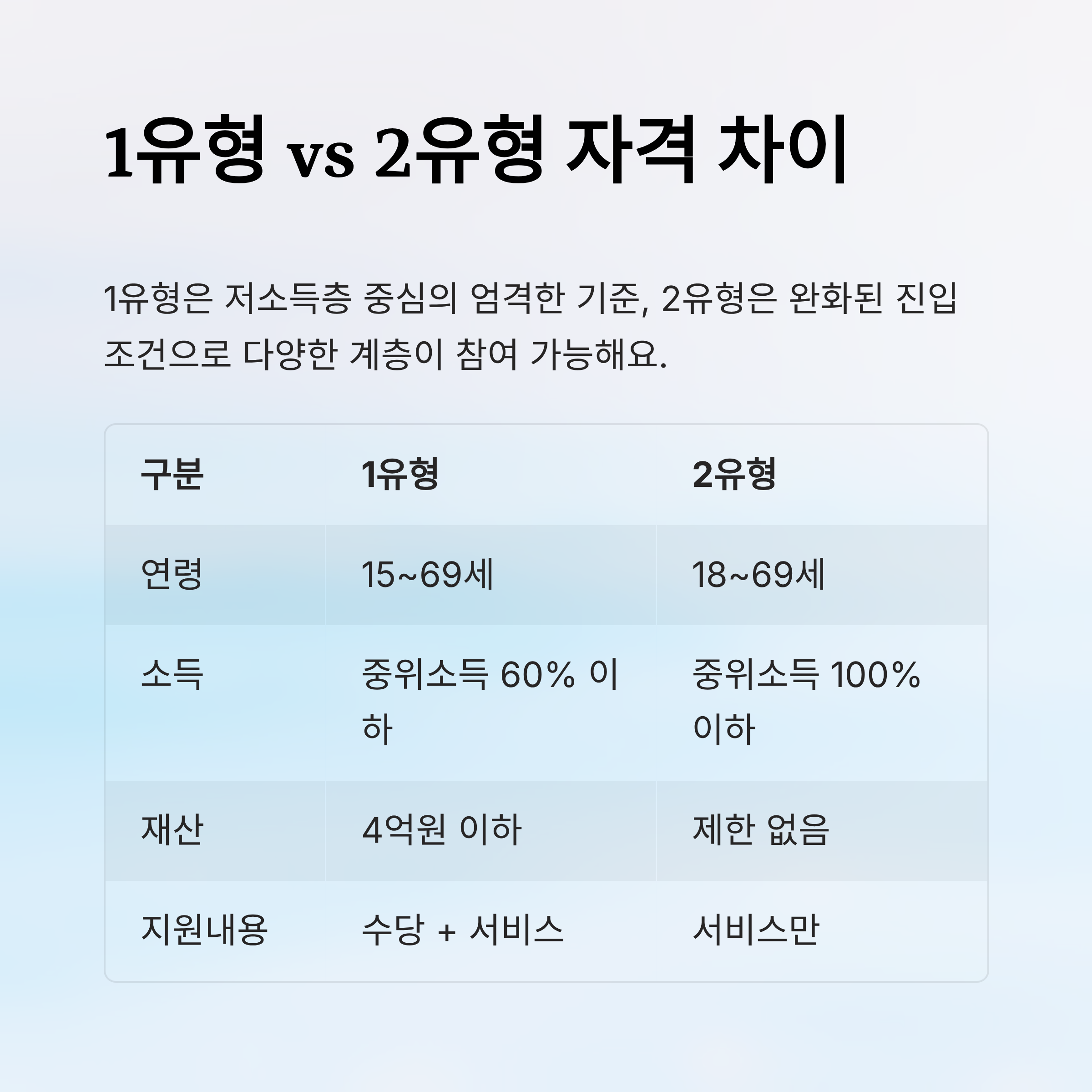 1유형은 저소득층을 중심으로 엄격한 소득, 재산 요건이 적용돼요. 연령은 15세~69세 사이여야 하고, 가구 중위소득 60% 이하, 재산 4억 원 이하(청년은 5억 원) 등의 기준을 충족해야 해요. 구직활동 경력도 일부 요구되죠.