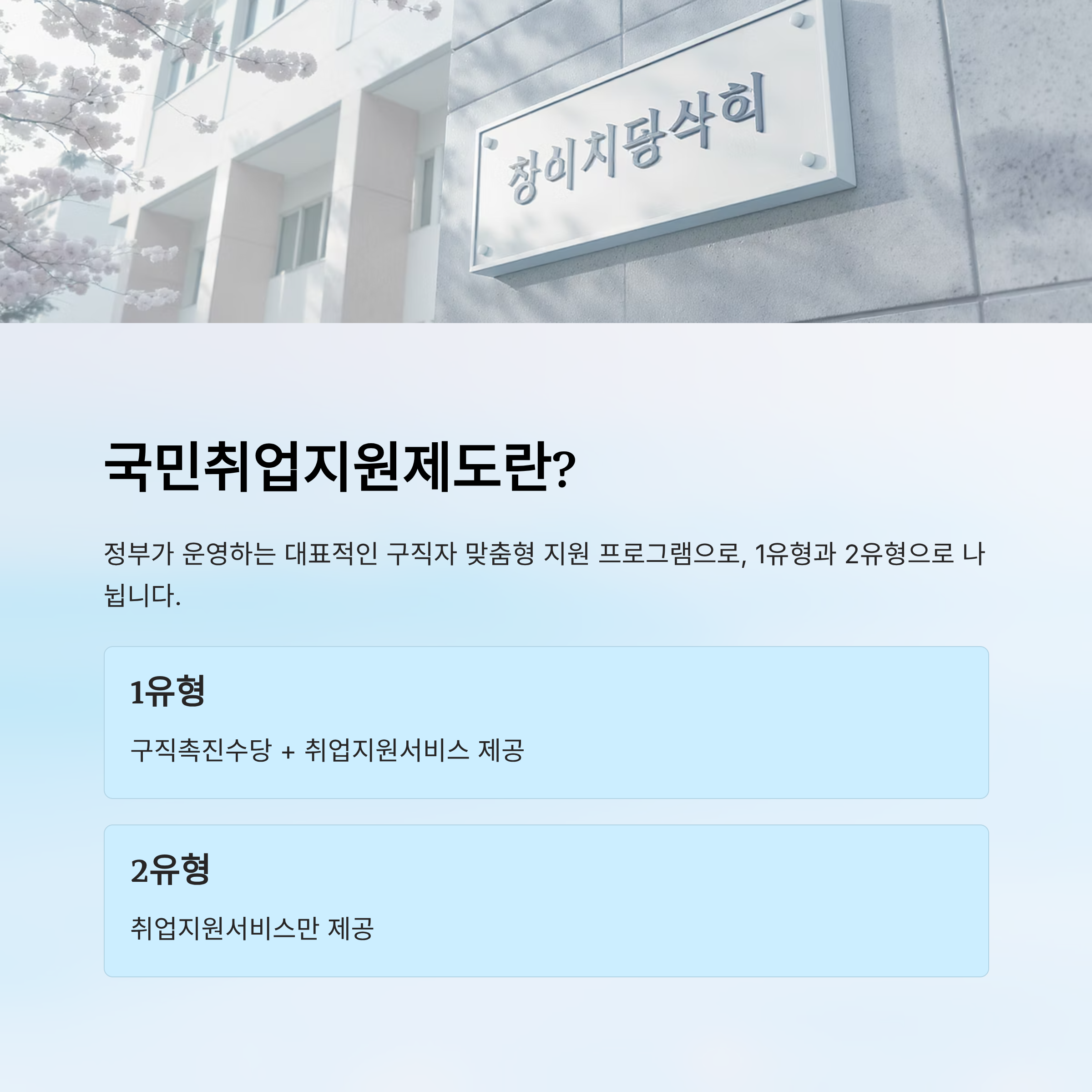 국민취업지원제도는 참여자의 조건에 따라 두 가지 유형으로 나뉘어요. 1유형은 구직촉진수당이 포함된 집중형 지원, 2유형은 상담 및 취업 알선 중심의 일반형 서비스라고 보면 이해하기 쉬워요. 😊