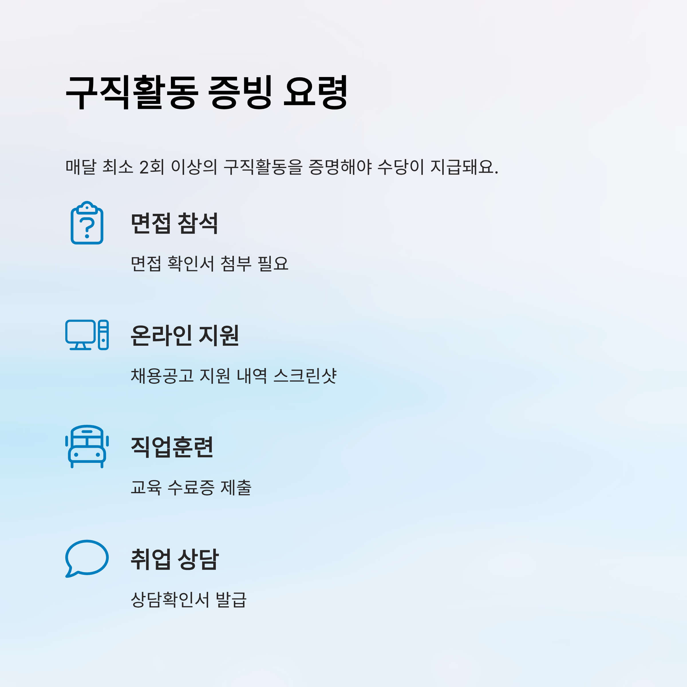 기본적으로 매달 최소 2회 이상의 활동을 해야 하고, 이 내용을 문서로 정리해 고용센터에 제출해야 해요. 인정되는 활동 예시는 다음과 같아요.