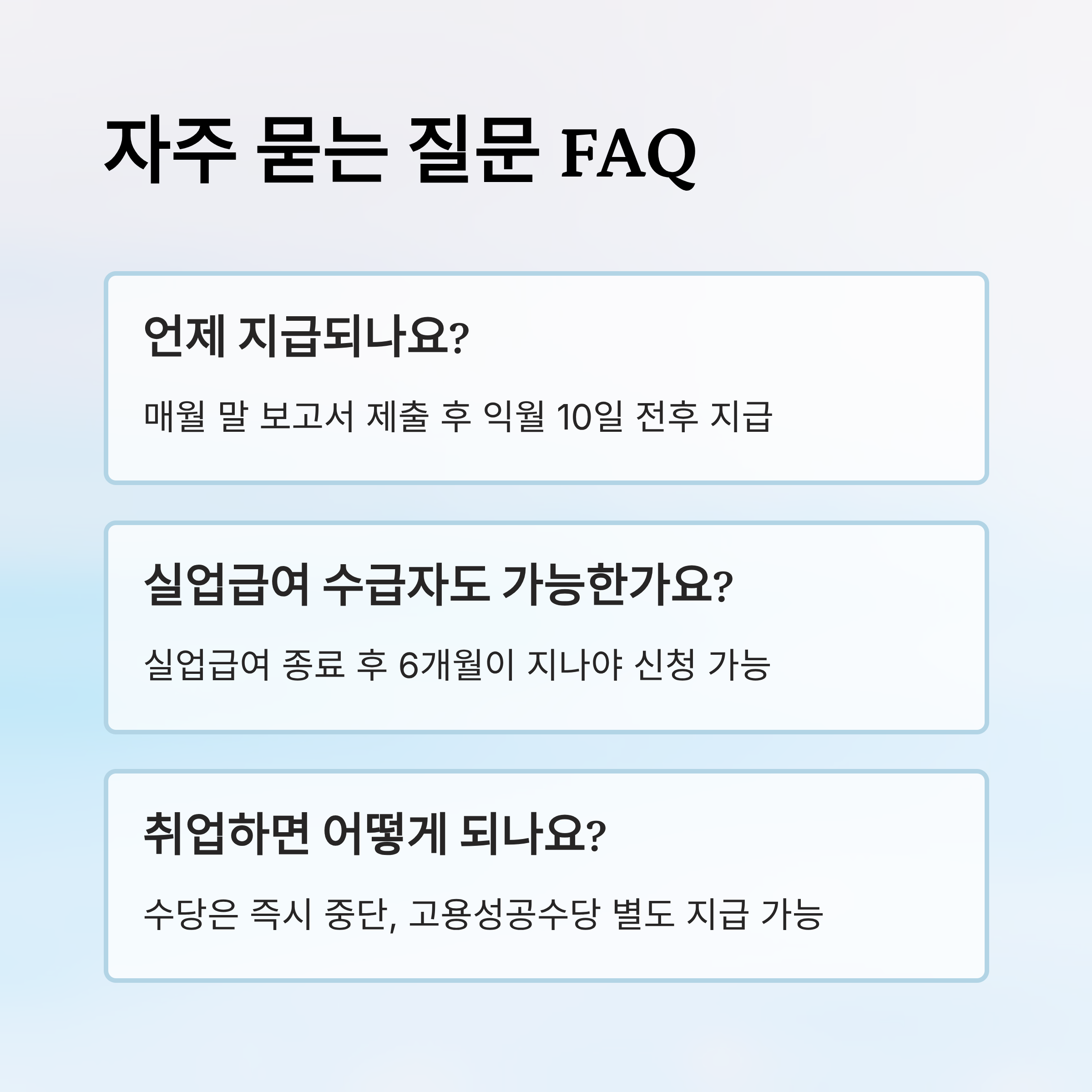 A2. 중간에 취업하면 수당 지급이 중단되며, 자격 미달 시 중단될 수 있어요.