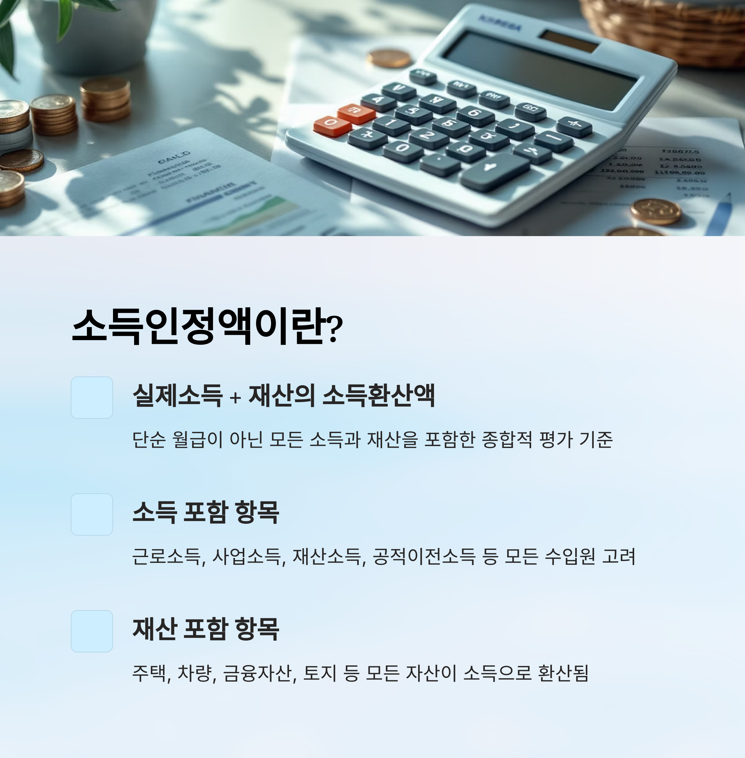 소득인정액은 단순한 월급 외에도 재산, 금융자산, 심지어 차량까지 고려해서 산정하는 복잡한 기준이에요. 내가 생각했을 때 이 기준을 제대로 이해하고 접근하는 것이 정말 중요하다고 느껴요.