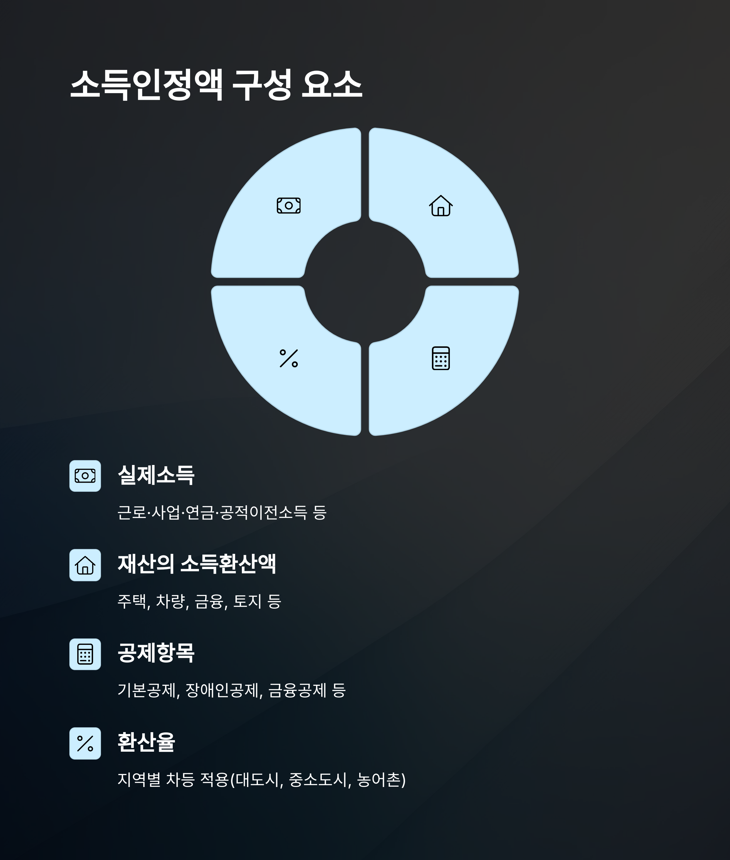 | 재산의 소득환산액 | 주택, 차량, 금융, 토지 등 | 환산율 적용(지역별 차이) |