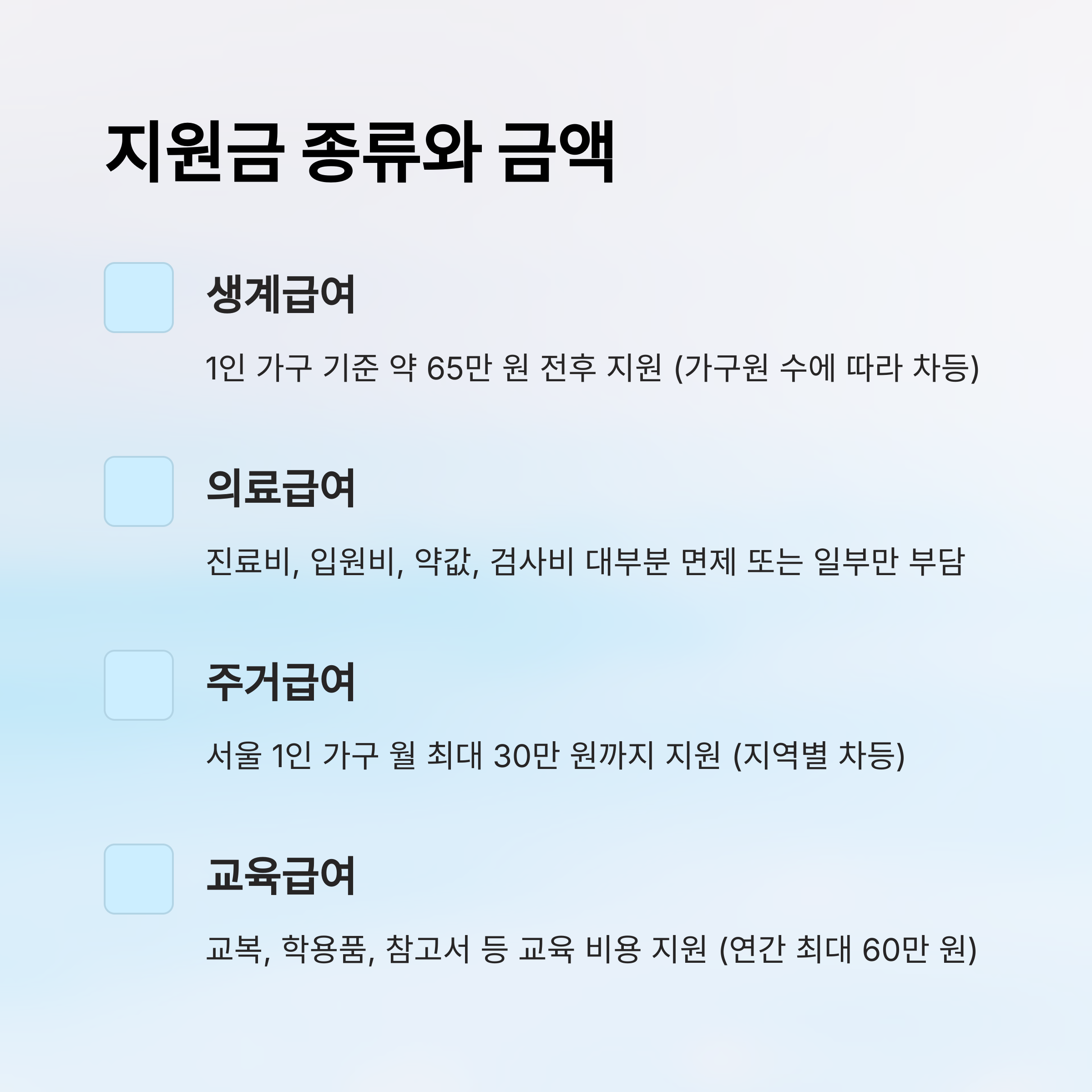 2025년 기준으로 1인 가구 기준 생계급여는 약 65만 원 전후예요. 여기에 의료급여는 진료비 대부분을 국가가 부담하고, 본인부담금은 거의 없어요. 입원비, 약값, 검사비도 대부분 면제되거나 일부만 내면 된답니다.