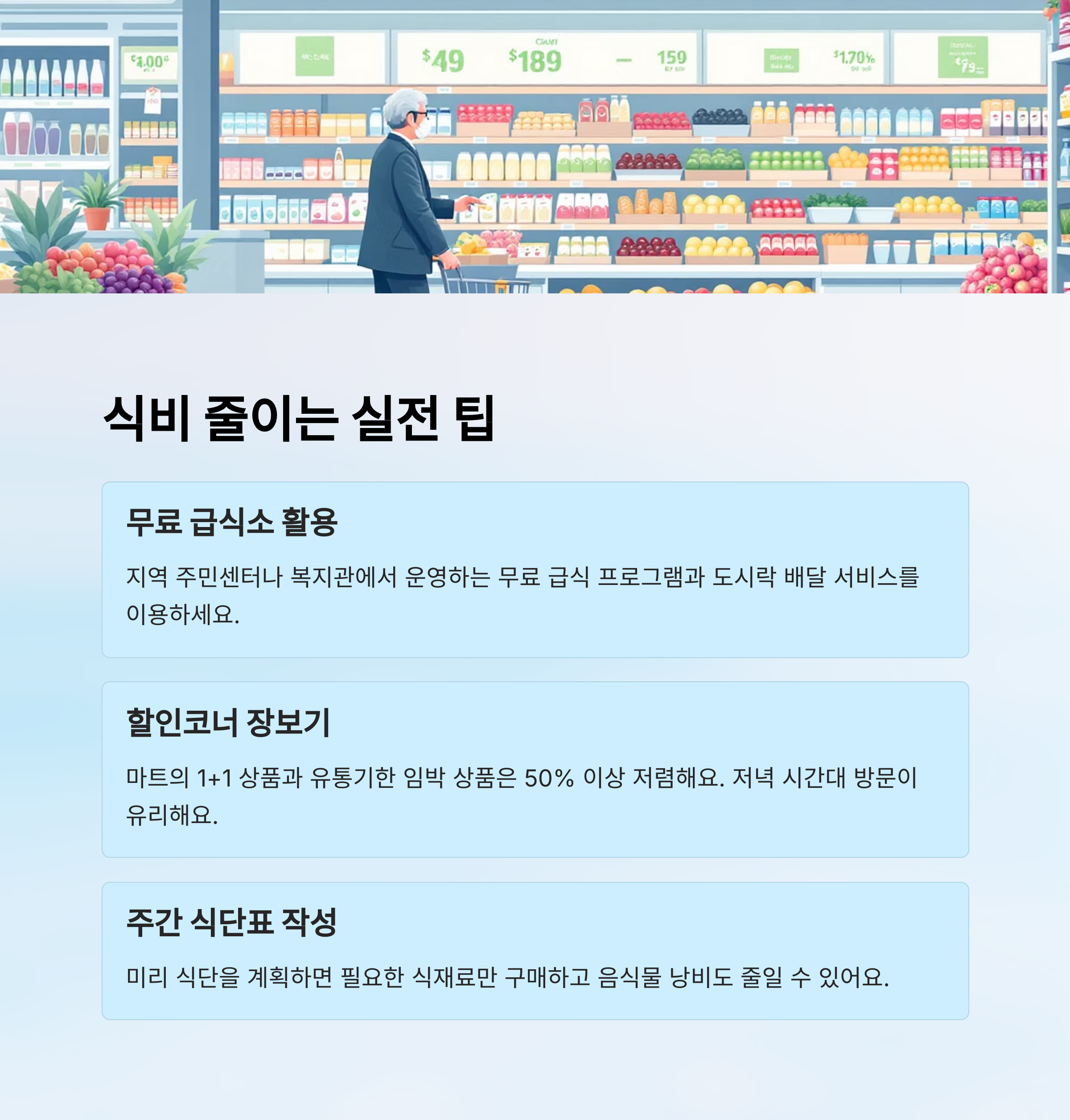 식비는 매일 드는 비용이기 때문에 잘 관리하면 큰 절약 효과를 볼 수 있어요. 특히 국민기초생활보장 수급자라면 식비 항목에서 정부나 지자체의 지원을 적극 활용해야 해요. 예를 들어 무료 급식소나 복지관 식사 서비스는 큰 도움이 될 수 있답니다.