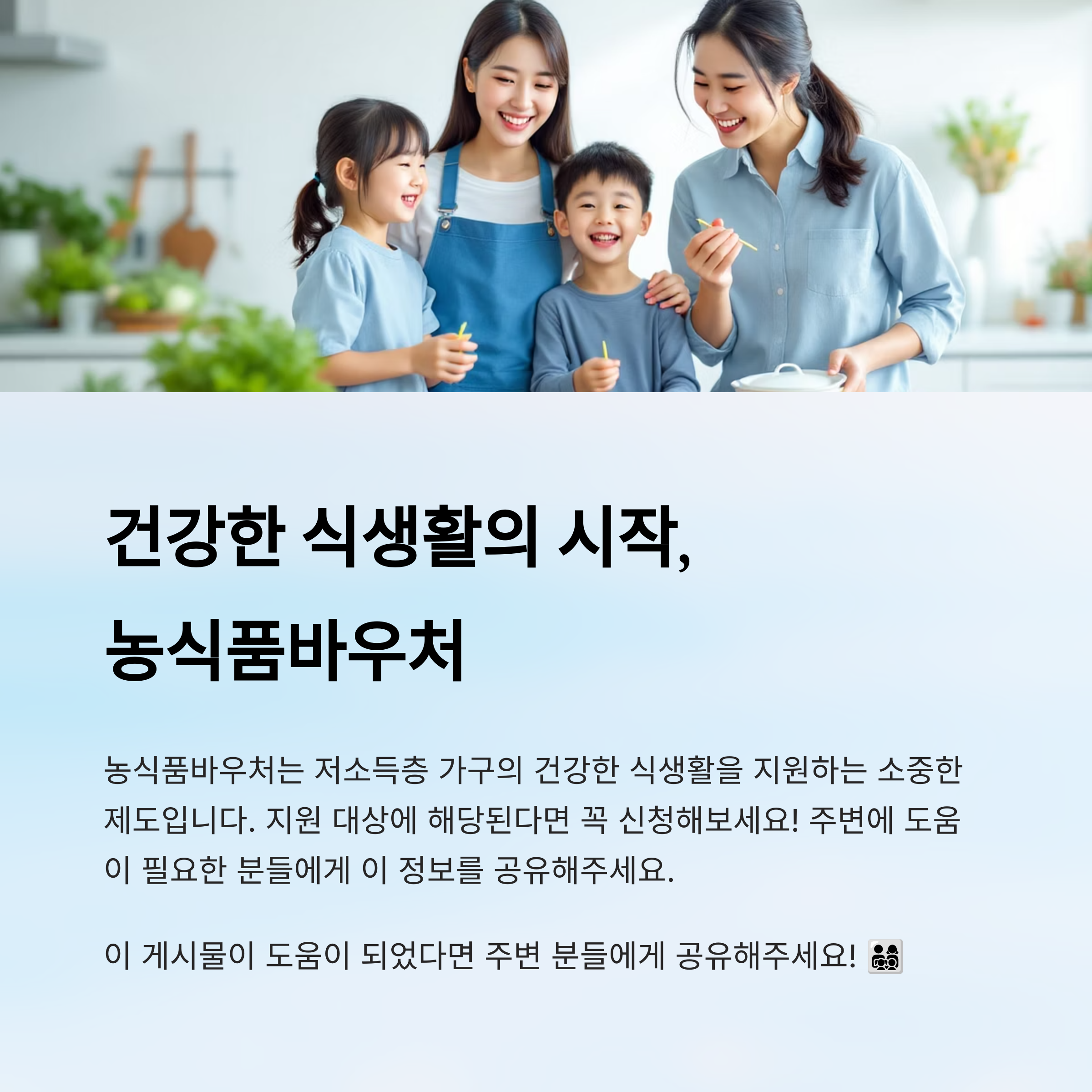 저소득 한부모 가정도 농식품바우처 지원 대상이에요. 부모 중 한 명이 아이를 양육하면서 경제적 어려움을 겪고 있는 경우 신청할 수 있답니다.