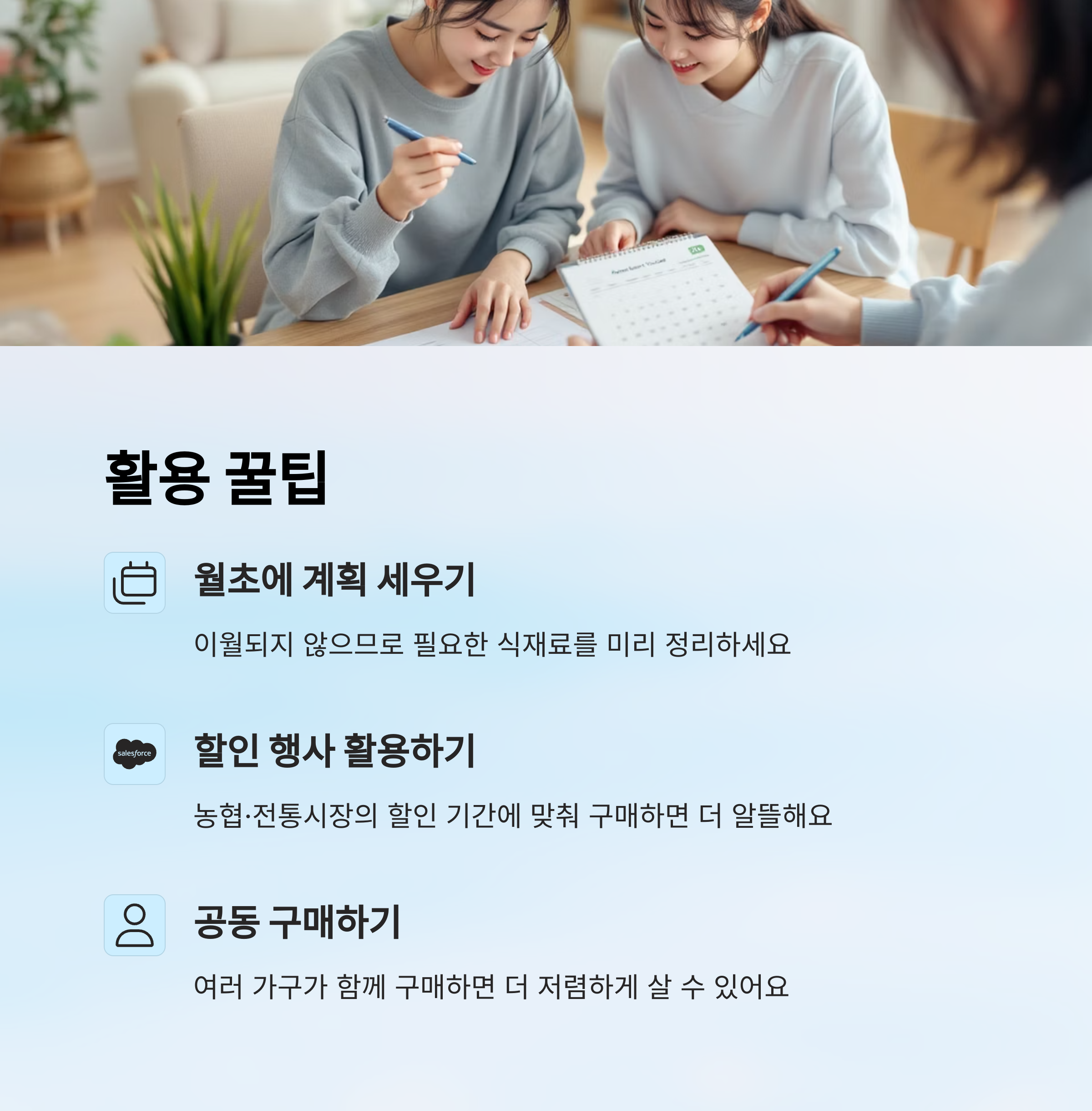 | 할인 행사 활용 | 농협·전통시장의 할인 기간에 맞춰 구매 |