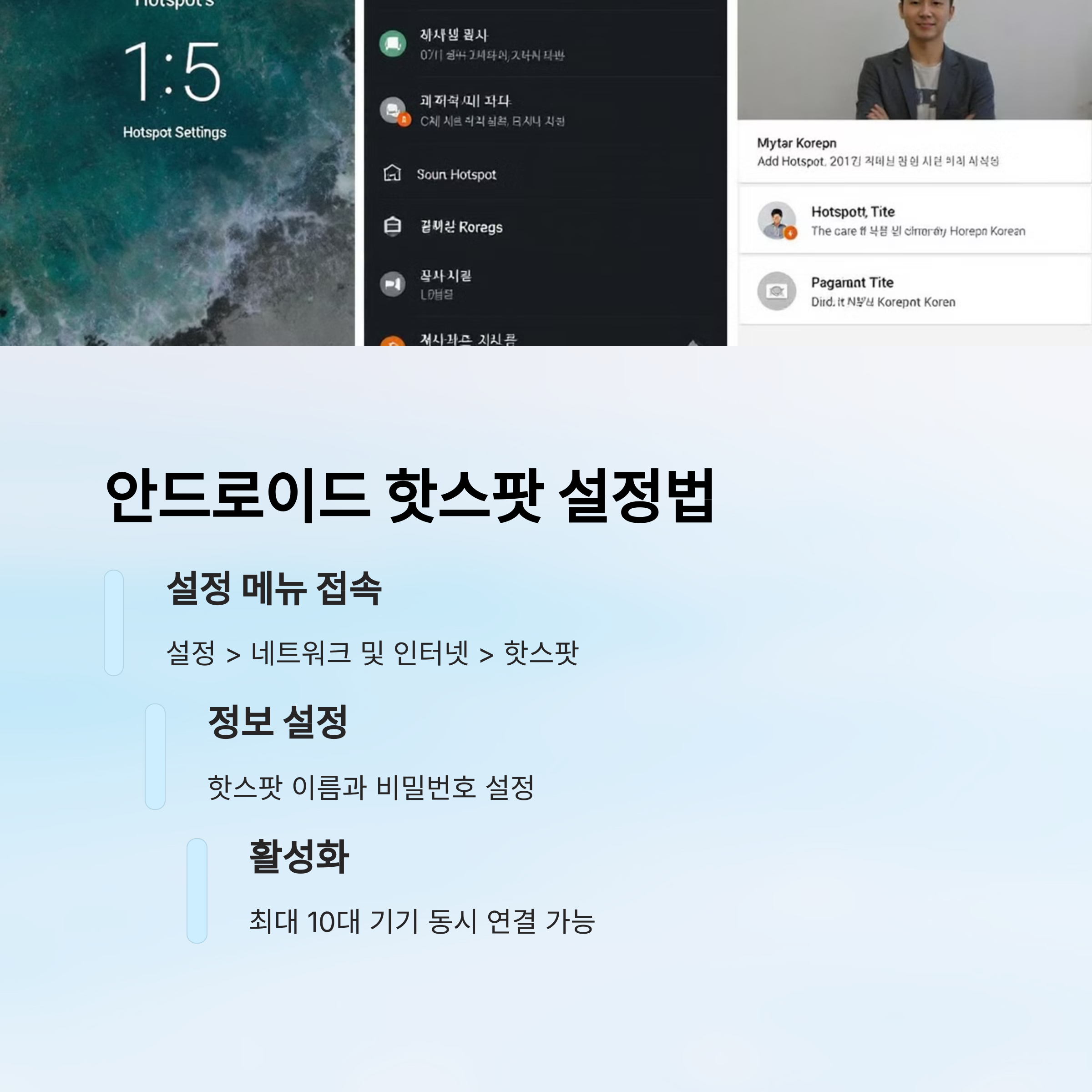 | 구분 | 설정 경로 | 핫스팟 이름 설정 | 비밀번호 설정 |