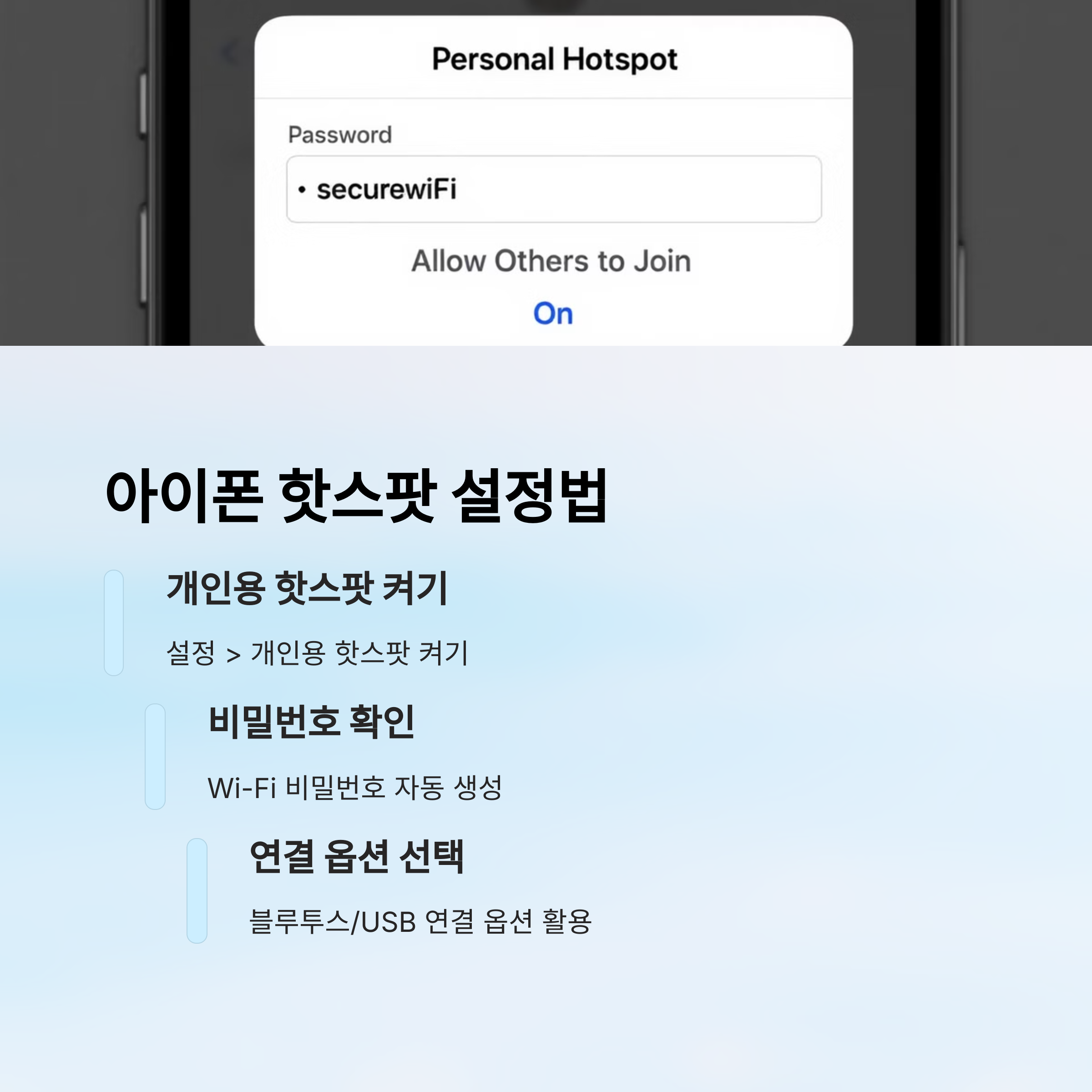 한 번 연결한 기기는 보통 자동으로 저장돼요. 그래서 다음 번에는 핫스팟을 켜기만 하면 자동 연결이 되죠. 단, 일부 아이폰은 보안을 위해 ‘연결 요청 허용’이 켜져 있어야 자동으로 연결될 수 있어요.