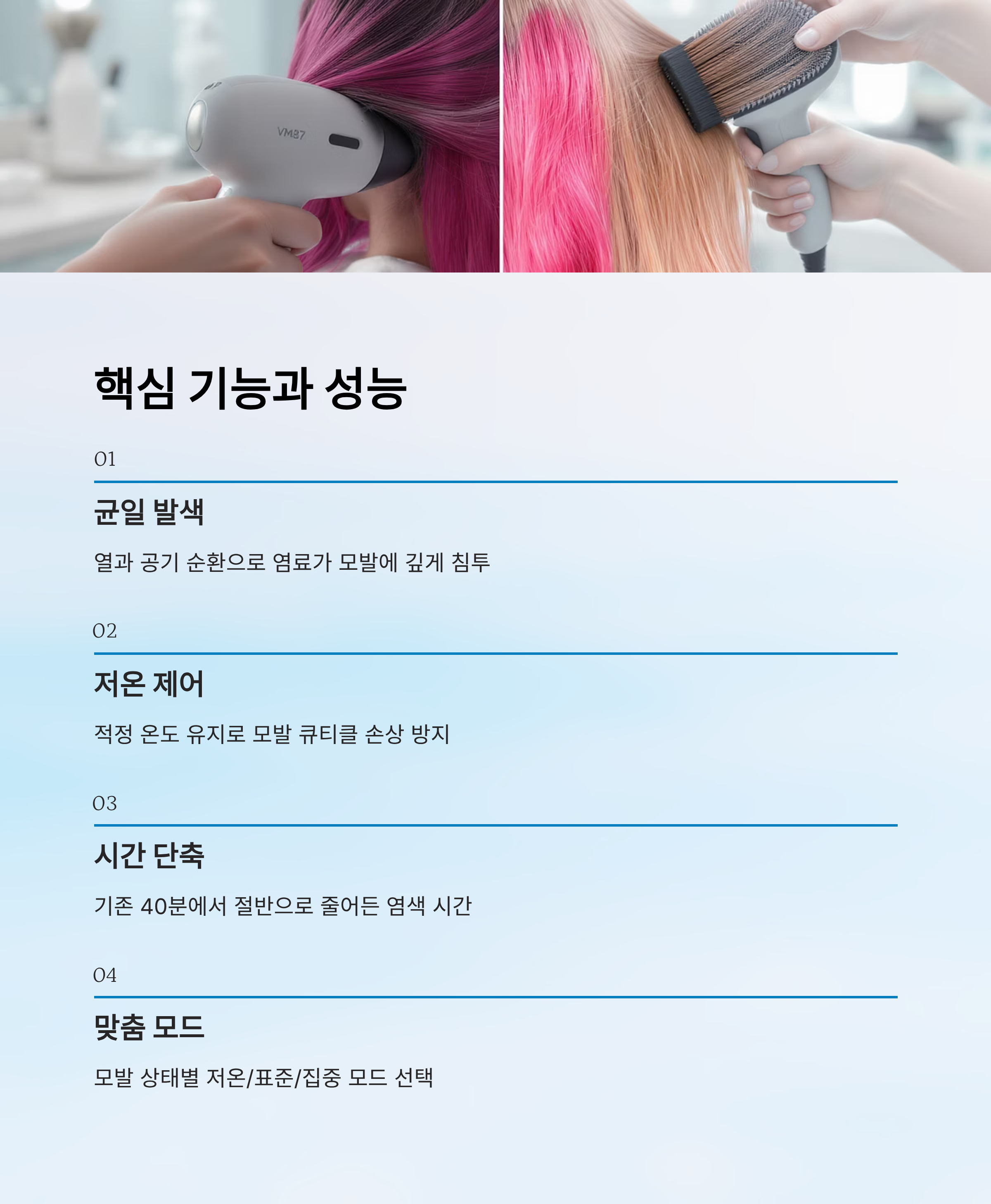 일반적으로 시중의 염색 기기들은 단순히 열을 가하거나 공기를 불어넣는 정도에 머무르는 경우가 많아요. 반면 VM87은 저온 제어 시스템과 균일 발색 기술을 탑재해 모발 손상을 최소화하면서도 발색력을 극대화해요. 이런 부분이 전문가들도 인정하는 차별점이에요. 🔍