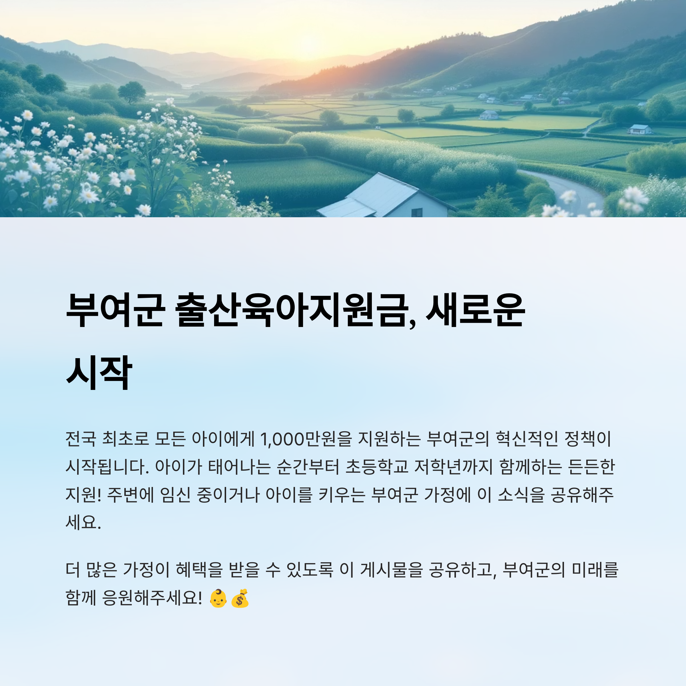 이 정책이 성공적으로 자리 잡으면, 부여군은 '아이 키우기 좋은 도시'라는 이미지로 거듭날 수 있어요. 이는 곧 인구 유입 효과로 이어지고, 정주 인구가 늘면서 마을, 학교, 지역서비스도 살아나는 선순환 구조를 만들 수 있어요.