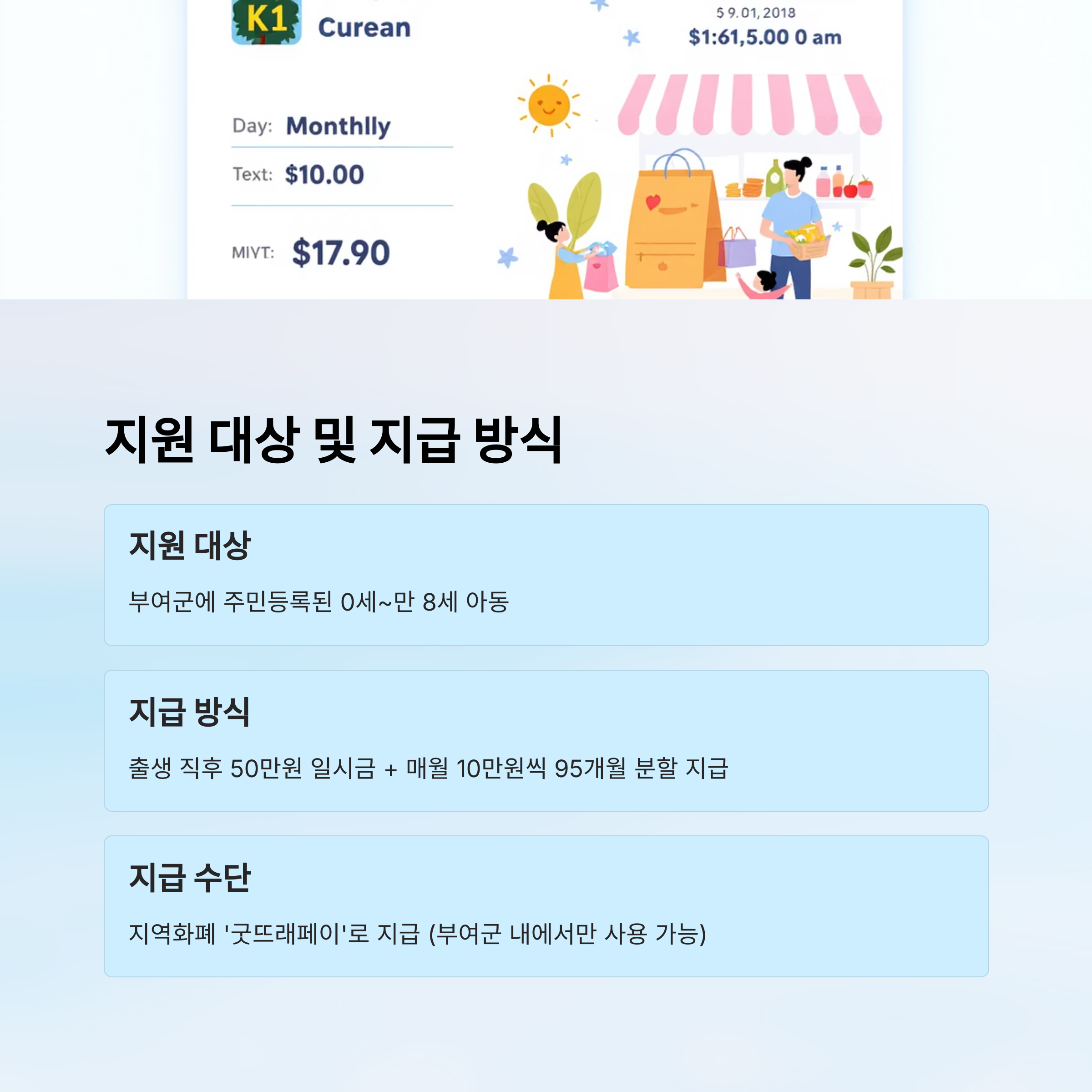 우선 지원 대상은 부여군에 주민등록이 되어 있는 0세부터 만 8세까지의 모든 아동이에요. 이는 초등학교 2학년 정도 나이까지 지원을 이어가겠다는 의미로, 아이가 자라는 초기 8년의 생활 전반을 포괄하는 개념이에요.