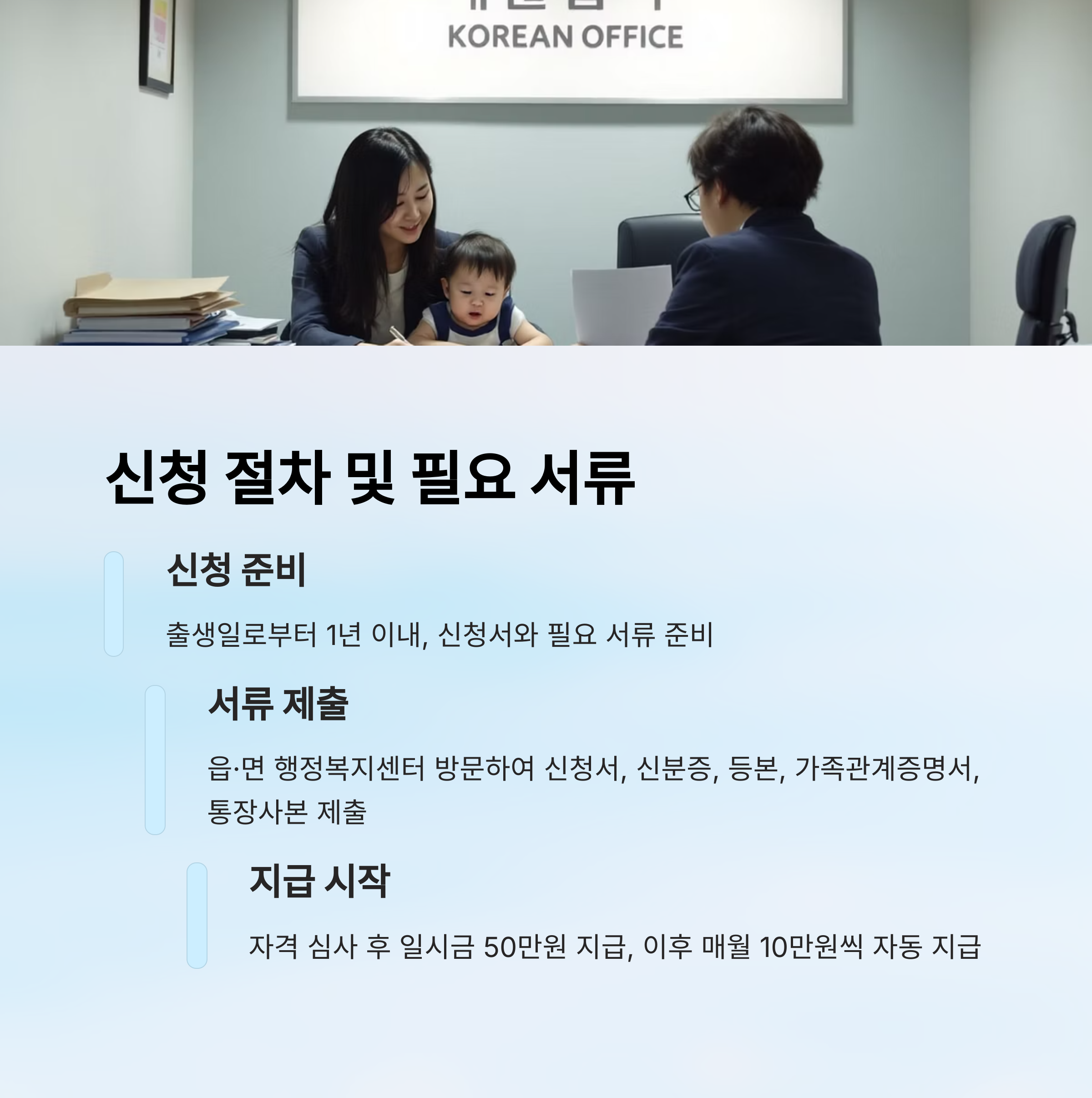 또한 이 제도는 간편한 신청 절차로 누구나 접근할 수 있도록 설계되었어요. 아동이 태어난 후 1년 이내에 읍·면 행정복지센터에 신청서와 필요한 서류를 제출하면, 자격 심사 후 자동으로 지급이 시작된답니다. 신청이 늦어지는 경우 일부 기간은 소급되지 않기 때문에 유의해야 해요.