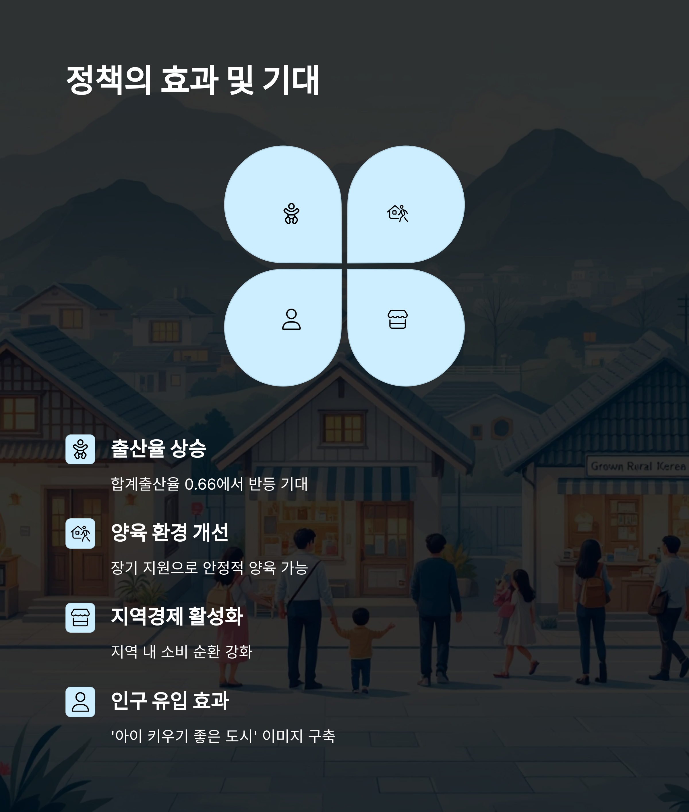이 제도는 출산율 회복이라는 단기적 목표뿐 아니라, 장기적으로는 아동의 삶의 질 향상과 지역사회의 지속 가능성까지 내다본 전략이에요. 단순히 인구 수만 늘리겠다는 것이 아니라, ‘아이 키우기 좋은 환경’을 만들겠다는 의지가 담겨 있어요. 💡