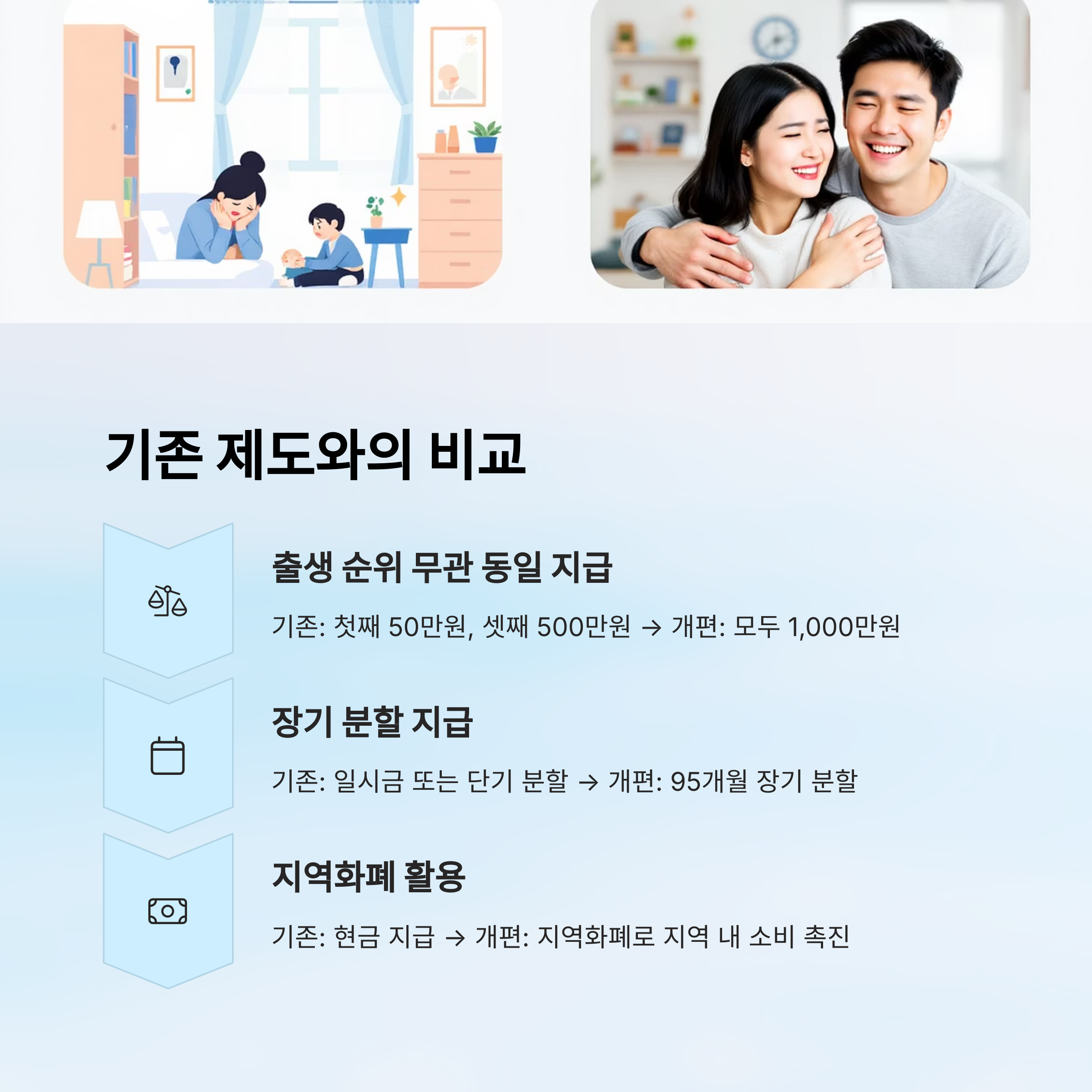 우선 가장 눈에 띄는 변화는 '출생 순위 무관 동일 지급'이에요. 예전에는 첫째 50만 원, 둘째 200만 원, 셋째 500만 원, 넷째 이상 1,000만 원처럼 출생 순위에 따라 차등 지급했어요. 하지만 이제는 누구나 최대 1,000만 원을 받을 수 있어요. 순위 없이 모든 아동이 동등한 가치를 인정받는 구조가 된 거죠.