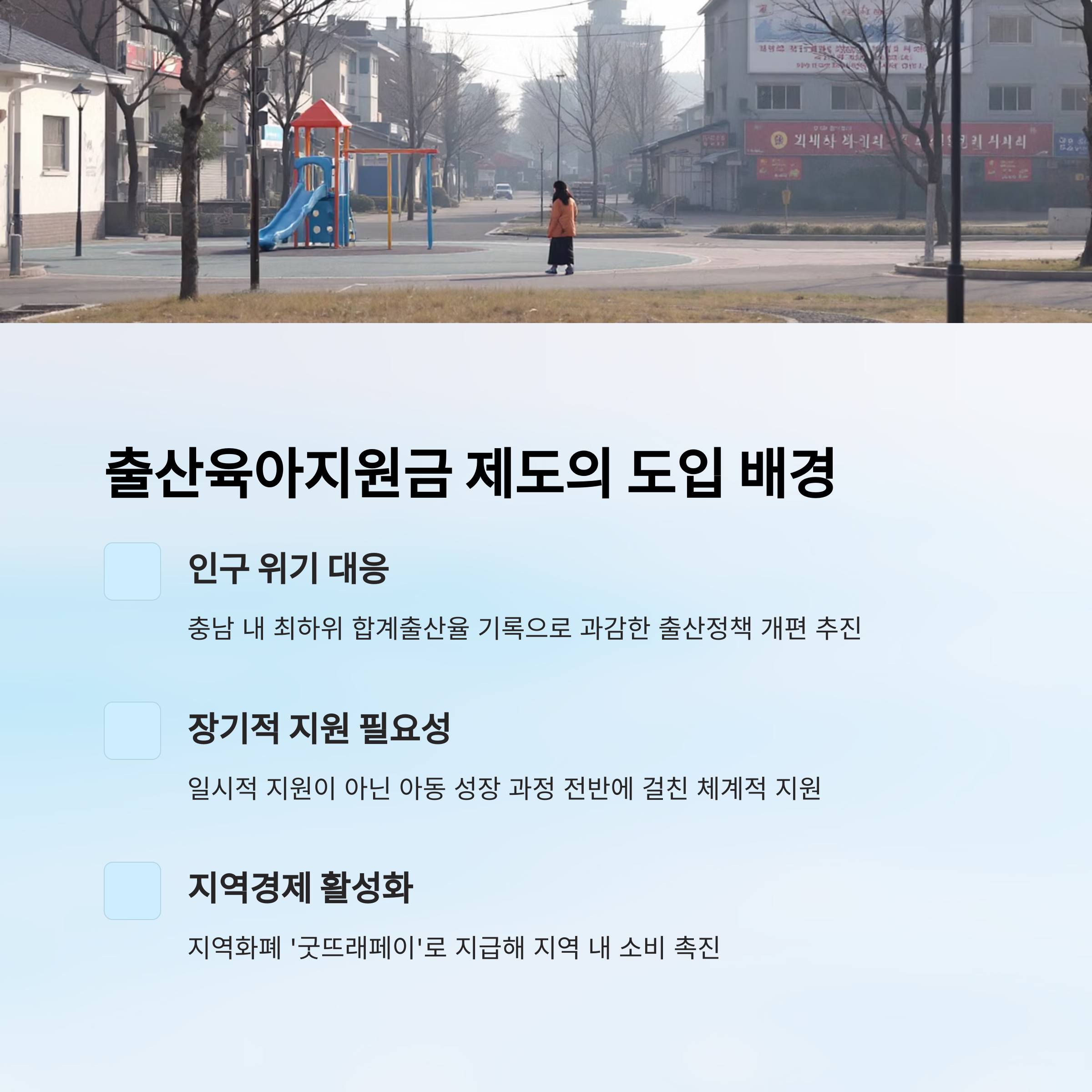 부여군은 단순한 현금 일시 지급 방식에서 벗어나, 아동이 태어나 성장하는 과정 전반에 걸쳐 꾸준하고 체계적인 지원이 필요하다는 인식에서 ‘출산육아지원금’ 제도를 기획했어요. 이는 단지 태어난 순간에만 지급되는 일회성 지원이 아니라, 아이가 초등학교 2학년이 될 때까지 매월 양육비를 지급한다는 점에서 큰 의미가 있어요.