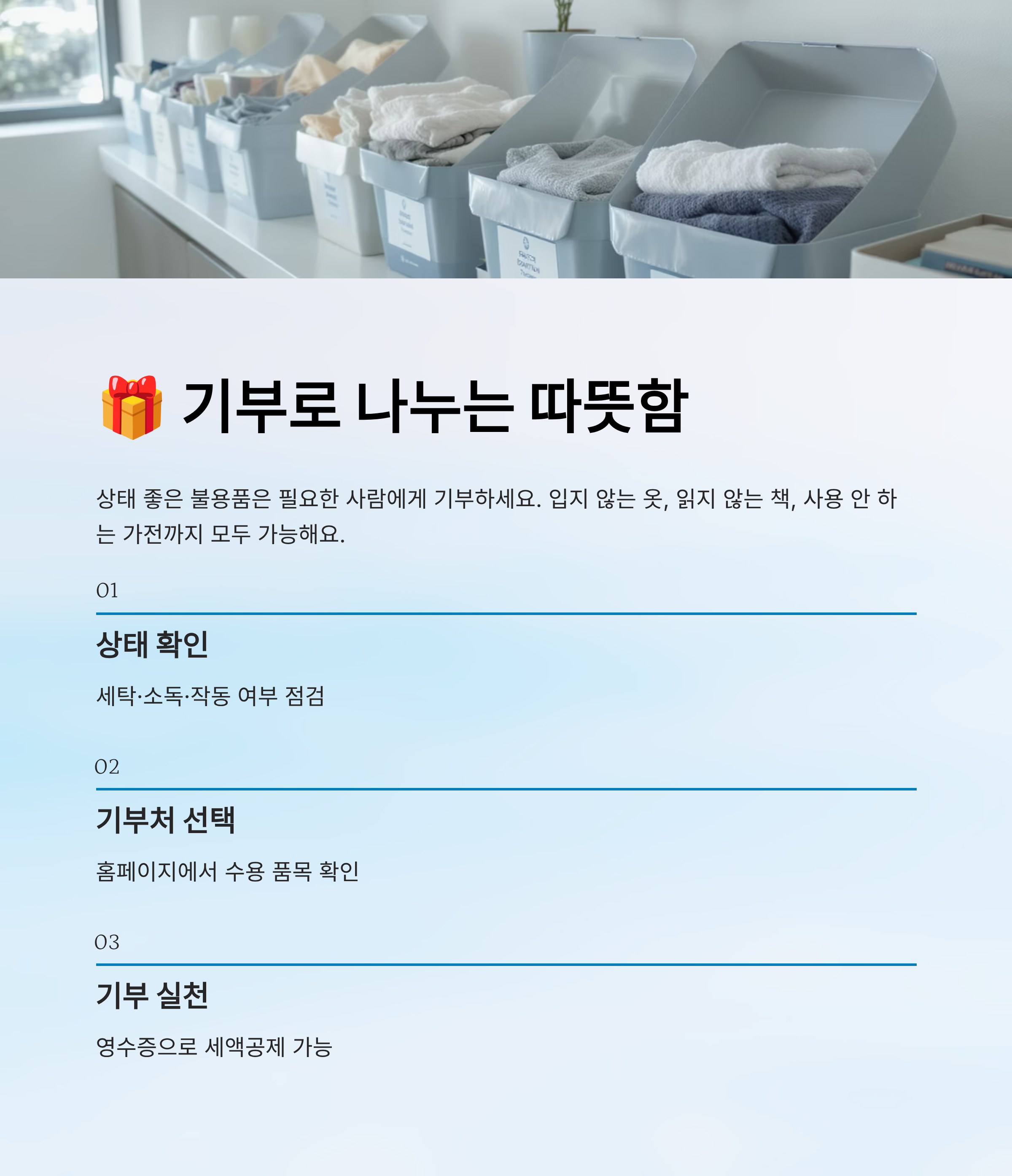 기부는 내 손을 떠나는 순간부터 또 다른 누군가에게 새로운 기회가 되기도 해요. 집 안의 공간도 여유로워지고, 마음도 따뜻해지는 경험을 할 수 있답니다. 환경과 사회에 동시에 긍정적인 영향을 주는 기부, 한 번 실천해보는 건 어떨까요? 😊