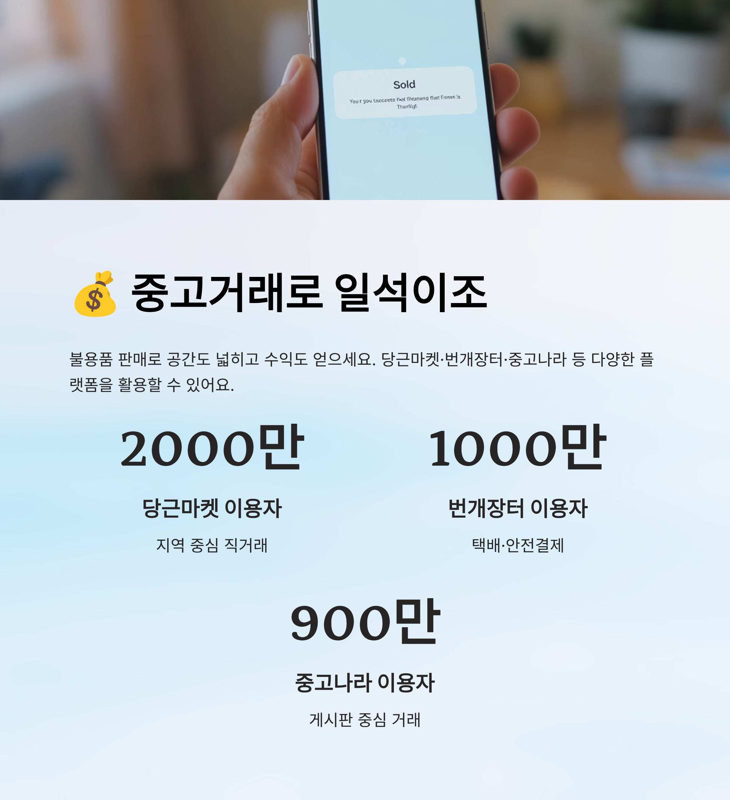 이처럼 플랫폼만 잘 선택해도 불용품 정리는 훨씬 쉬워지고 의미 있는 소비로 연결될 수 있어요. 앱 하나만 설치해도 우리의 삶이 훨씬 정리되고 환경에도 이로울 수 있답니다! 📦