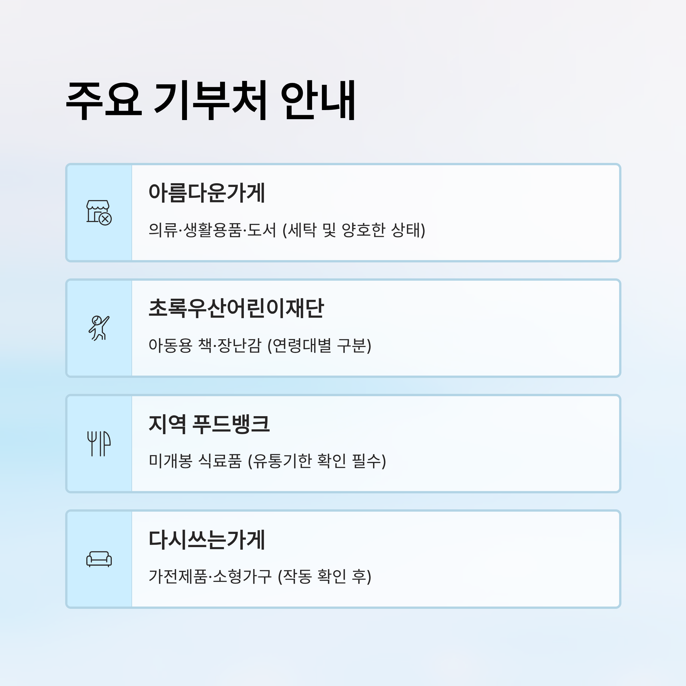 기부처에 따라 필요한 물품 종류가 다르기 때문에, 홈페이지나 전화를 통해 기부 가능 품목을 확인해보는 것도 좋은 방법이에요. 예를 들어, 어떤 기관은 아동용 책만 받는 반면, 다른 곳은 가전제품도 환영할 수 있답니다.