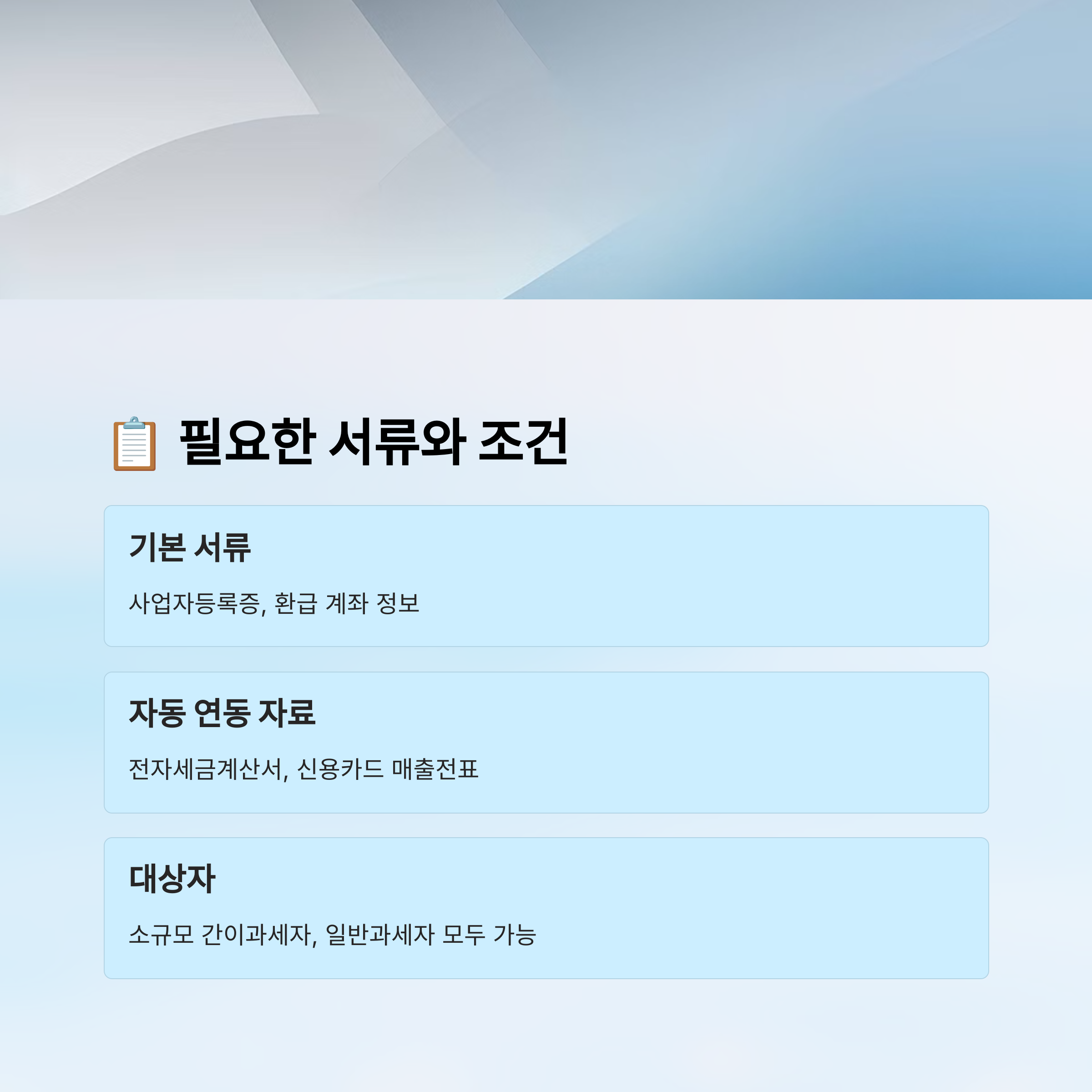 원클릭을 통해 부가세를 신고하려면 필요한 준비물은 생각보다 간단해요. 우선 필수로 필요한 건 사업자 등록번호와 공동인증서예요. 이 두 가지가 준비되어 있어야 국세청 자료와 연동이 가능하답니다.
