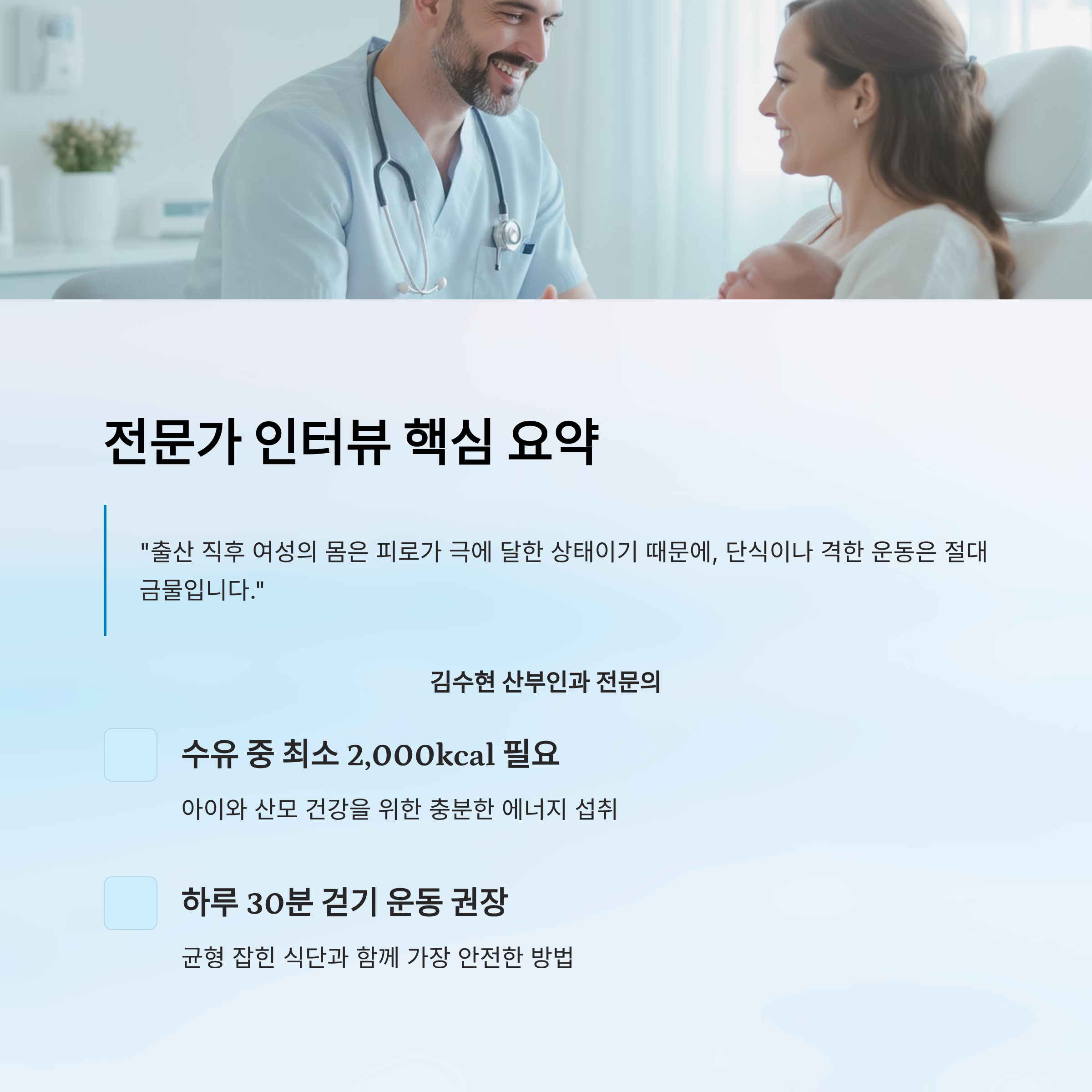 또한 김 원장님은 수유 중인 산모라면 하루 최소 2,000kcal 이상의 에너지가 필요하다고 강조했어요. 아이에게 영양을 전달하면서 본인의 건강까지 유지하려면 무리한 감량은 오히려 역효과가 날 수 있다고 하셨어요.