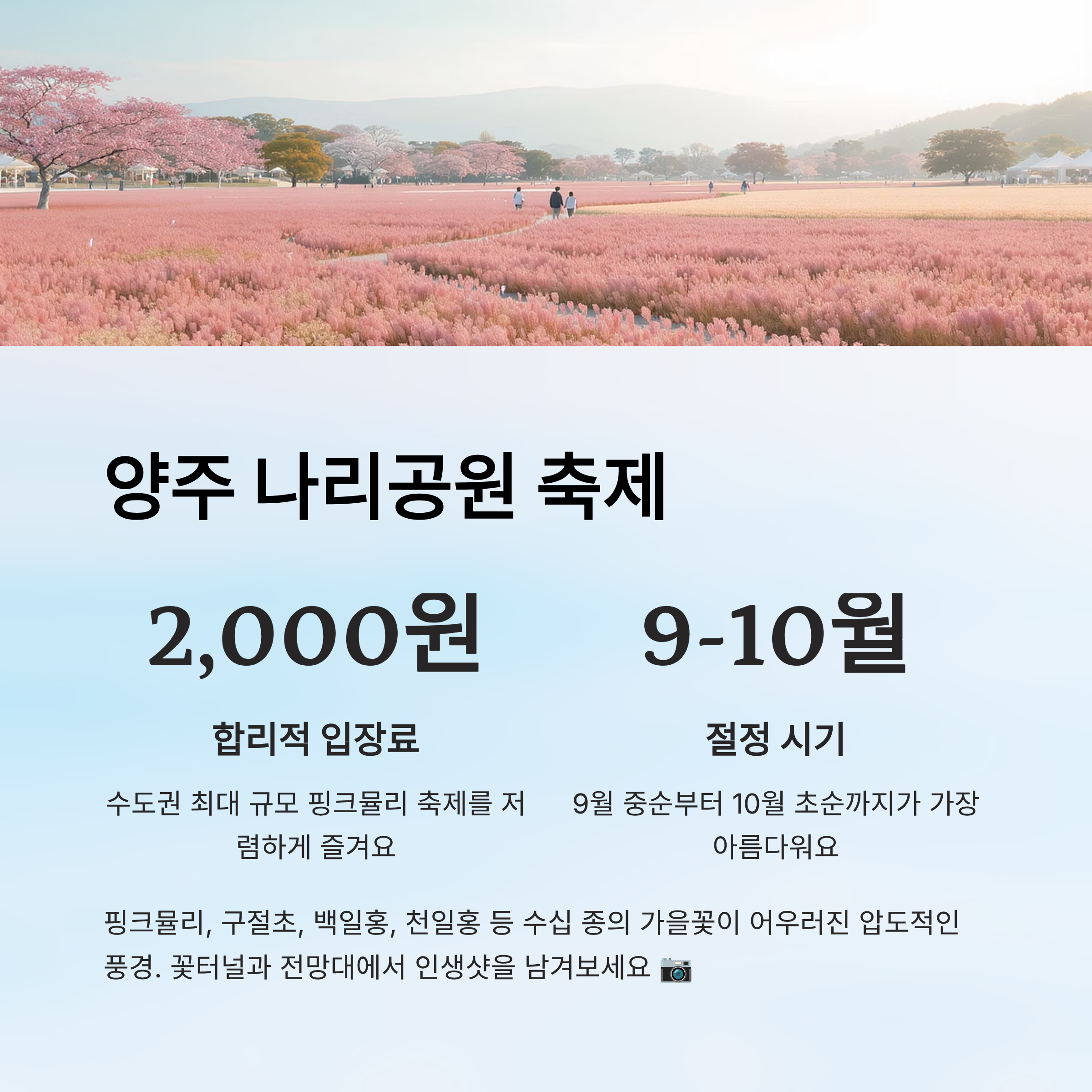 | 나리공원 | 경기 양주 | 2,000원 | 지하철+버스 | 핑크뮬리 + 가을꽃 총집합 |