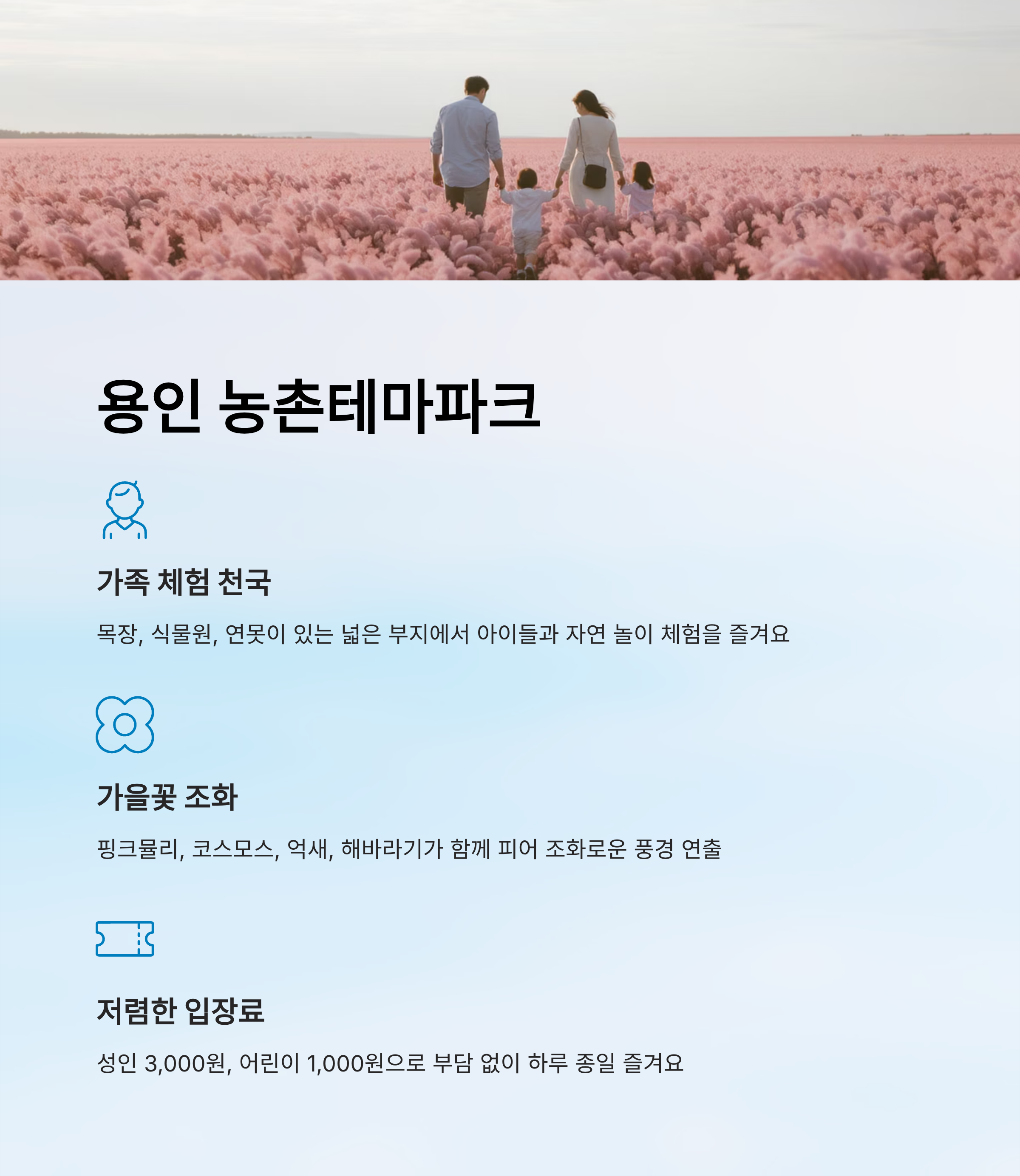 | 농촌테마파크 | 경기 용인 | 3,000원 | 가족 체험, 목장, 꽃정원 | 무료 |