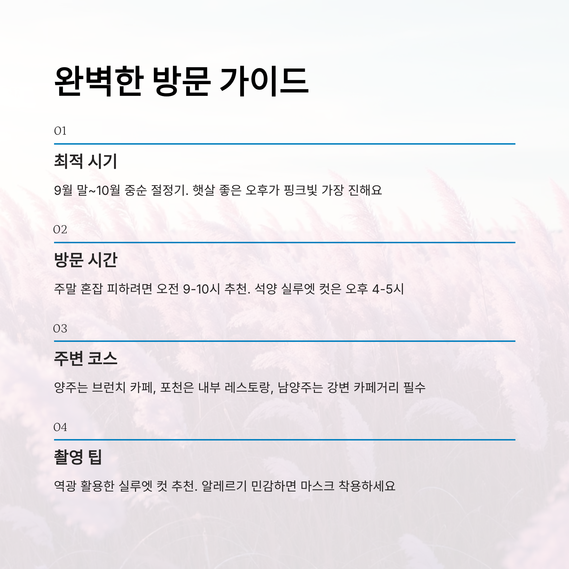 특히 해질 무렵의 핑크뮬리는 빛을 받아 반짝이며 몽환적인 분위기를 연출해요. 도보 여행, 자전거 여행자들에게도 인기 많은 코스로, 별도의 입장료가 없다는 것도 큰 장점이에요.