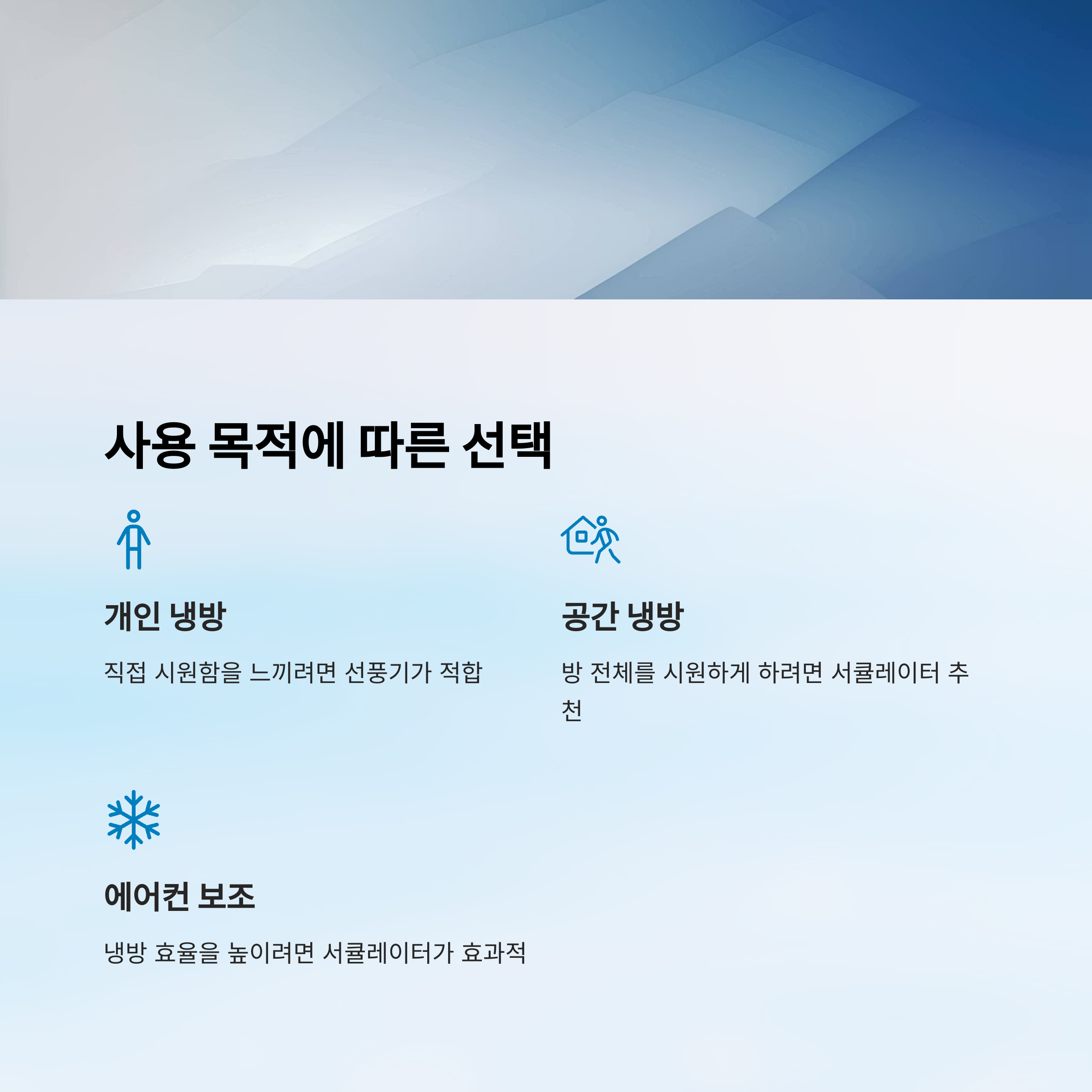 선풍기는 '직접 시원함을 느끼는 용도'에 적합해요. 더운 날 땀을 식히고 싶을 때, 자기 전에 몸을 식히고 싶을 때 가장 유용하죠. 반면 서큘레이터는 공간 전체를 고르게 시원하게 만들고, 냉난방기의 보조 역할을 하기 위해 사용돼요.