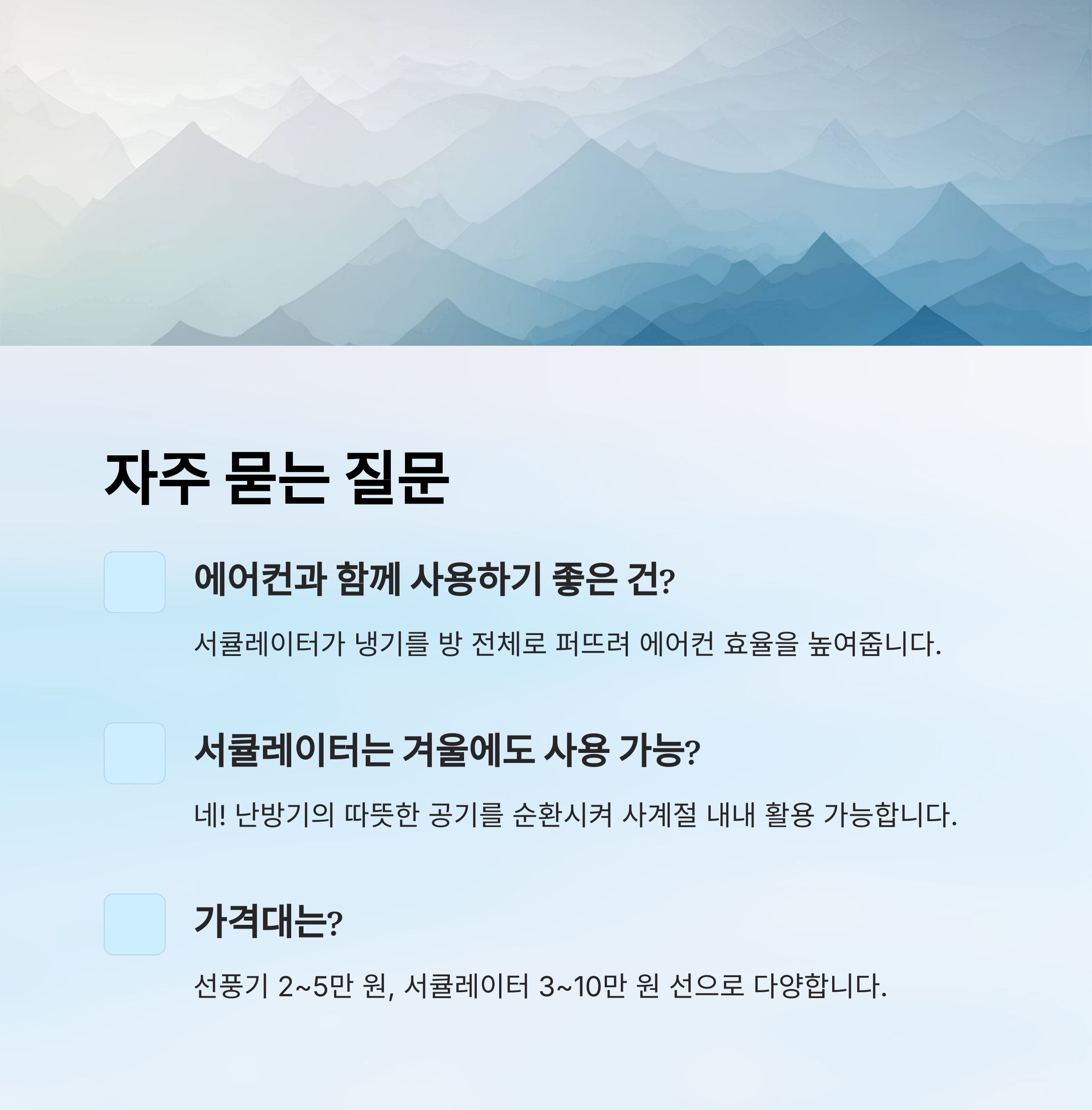 A7. 선풍기는 보급형이 많아 2~5만 원이면 괜찮은 제품을 살 수 있고, 서큘레이터는 기능에 따라 3~10만 원 선까지 다양해요. 다이슨처럼 프리미엄 제품은 더 비싸기도 해요.