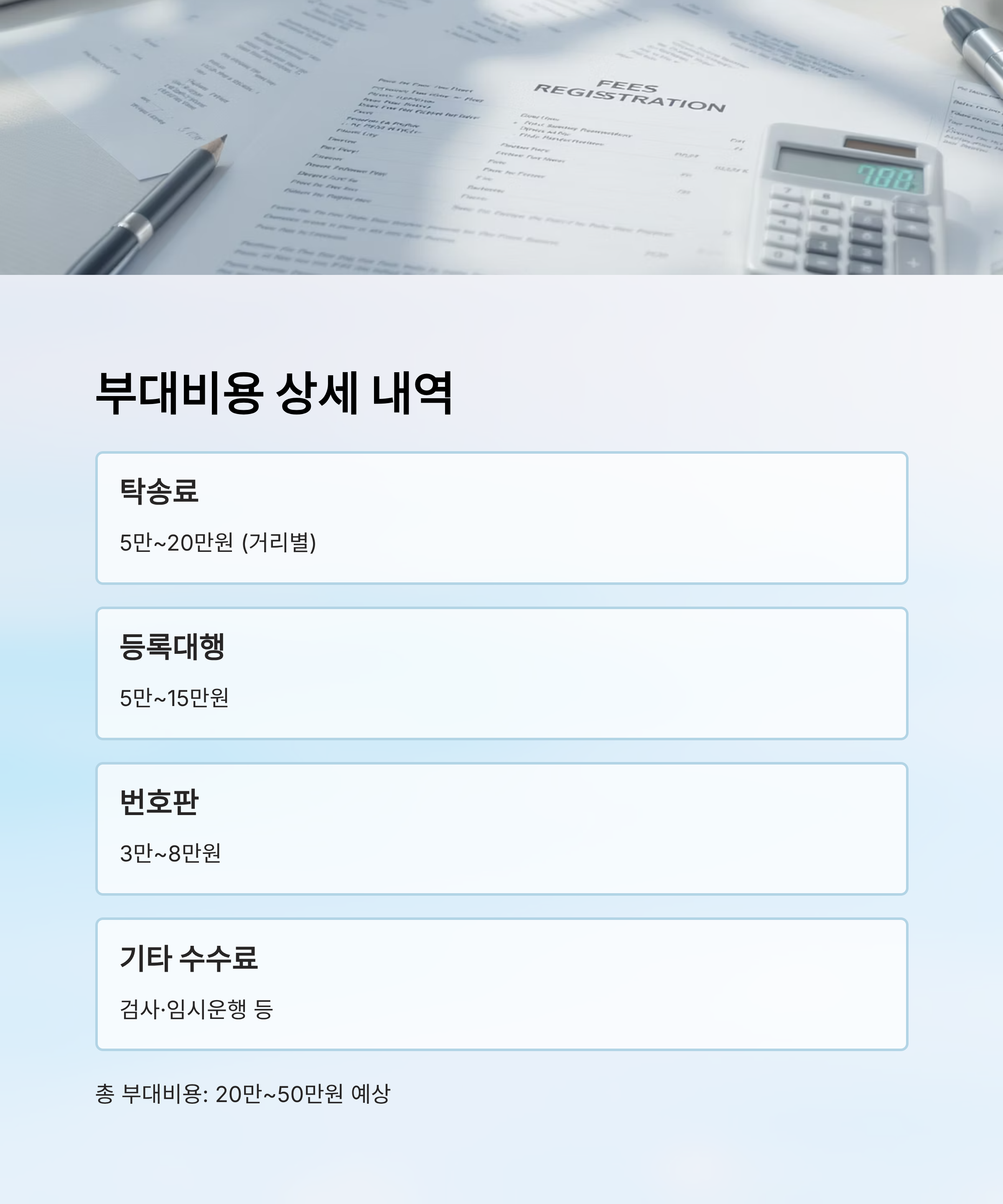 탁송료는 출고지와 인수지 거리에 비례해 5만~20만 원 범위가 일반적이에요. 번호판 비용은 보통 3만~8만 원 사이, 등록대행 수수료는 5만~15만 원, 임시운행허가·검사 수수료 등 부속 항목을 합치면 총 10만~30만 원 정도가 더해지곤 해요. 직영점에서 일괄 포함한다고 해도 명세서를 통해 항목별 금액을 반드시 확인해요.