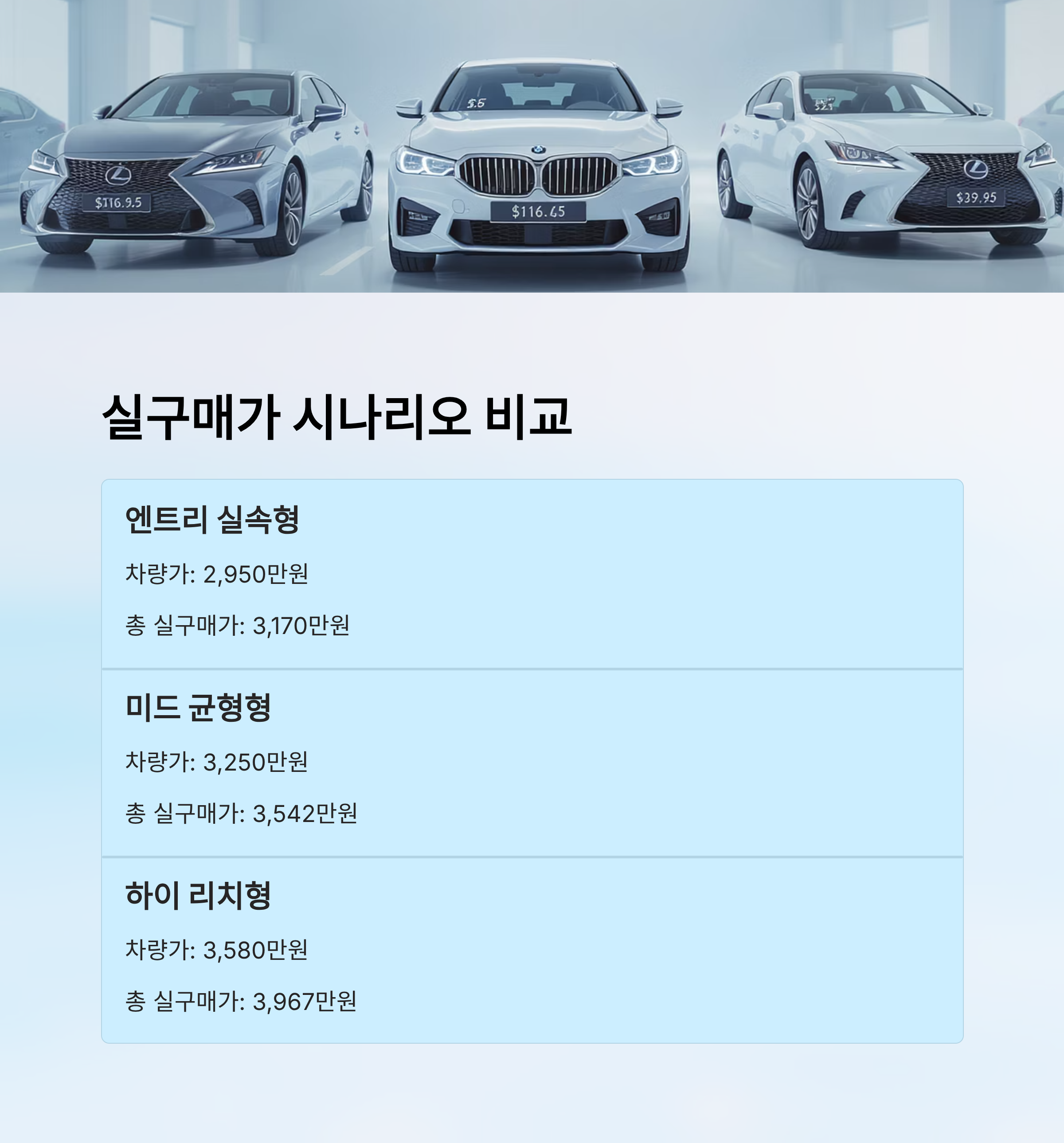여기서는 엔트리·미드·하이 트림을 각각 합리적 구성으로 가정해 실구매가를 추정해요. 세금·부대비용 범위와 옵션 최소·권장 조합을 더해 현실적인 총액을 도출해요. 금융은 평균 금리대 기준으로 간단히 월 납입을 가늠해요.