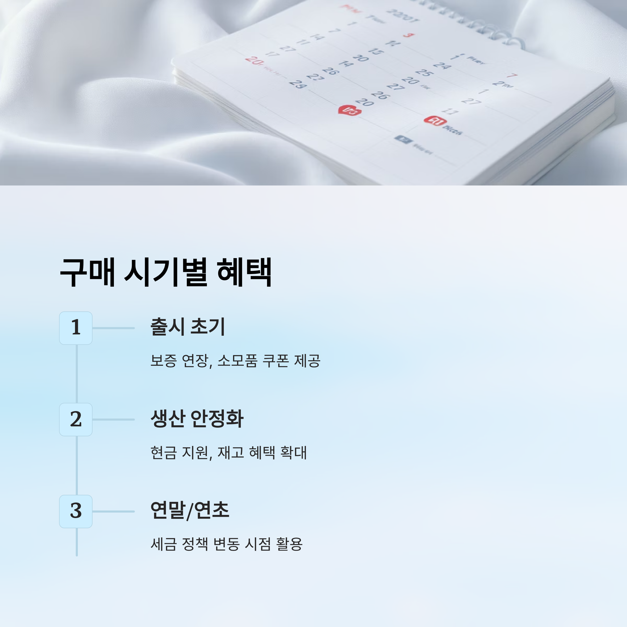 A8. 초기 물량 피크가 지나 생산 안정화·분기말·연말 재고 조정 시점에 금융 금리·사은 혜택이 개선되는 경우가 많아요.